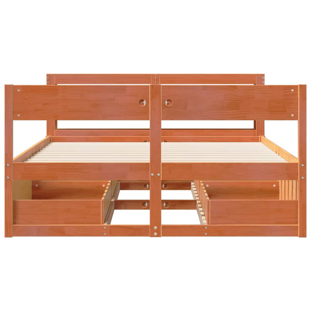 Get a better restful night's sleep from this bed frame! It makes a welcoming addition to any bedroom. Stable and long-lasting frame: Solid pinewood is known for its strength and durability. Its straight grains and distinctive knots contribute to its rustic charm.Slatted base for optimal support: The bed frame is equipped with a slatted base for support and breathability for your mattress.Make full use of space: This bed frame features four drawers underneath, providing storage for items like extra bedding, seasonal clothing, and toys.Ample storage space: This sleek headboard of the bed features two convenient shelves, offering ample storage space to keep all your nighttime essentials within easy reach.Freestanding headboard: The freestanding headboard offers a hassle-free solution for effortless placement and repositioning without the need for wall installation. Good to know:A mattress is not included with this bed. We do offer a various selection of mattresses. You can check our shop for a matching mattress.