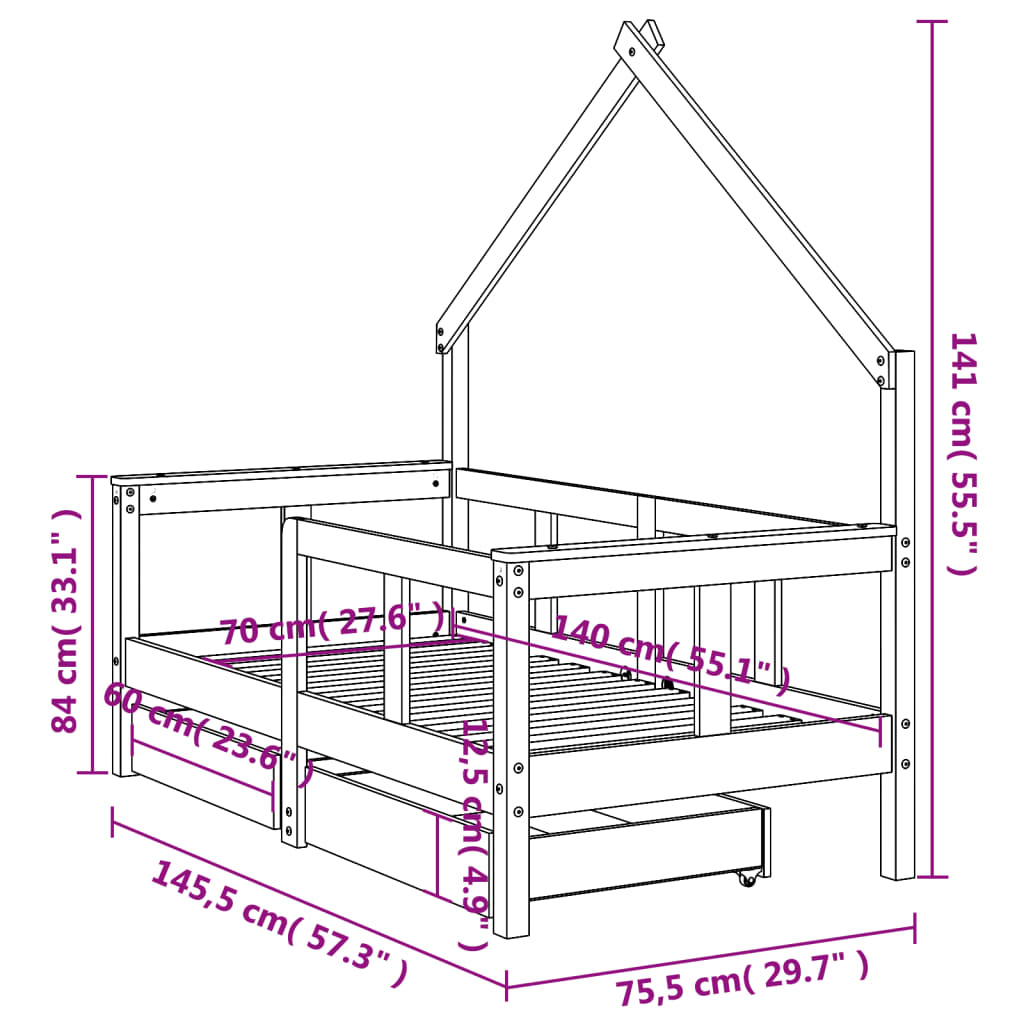 Create a fun-filled space for your little one with this fantastic wooden kids bed frame! Solid pine wood: The kids bed frame is made from solid pine wood. Solid pine wood is a beautiful natural material. Pine wood has a straight grain, and the knots give the material its signature, rustic look.Sturdy slats: The bed for kids has wooden slats for firm support, ventilation and stability.House bed design: This toddler bed featuring a cool yet simplistic design turns bedtime into a fun experience. It offers many possibilities for playing and building your child's little world to stimulate creativity and imagination.Storage drawer: The included storage drawers provide ample space for storing small toys, clothing and bedding, keeping the room tidy and clean.Considerate design: The height of the kids single bed is designed to be low to the ground, making it easy for your child to get in and out of bed.