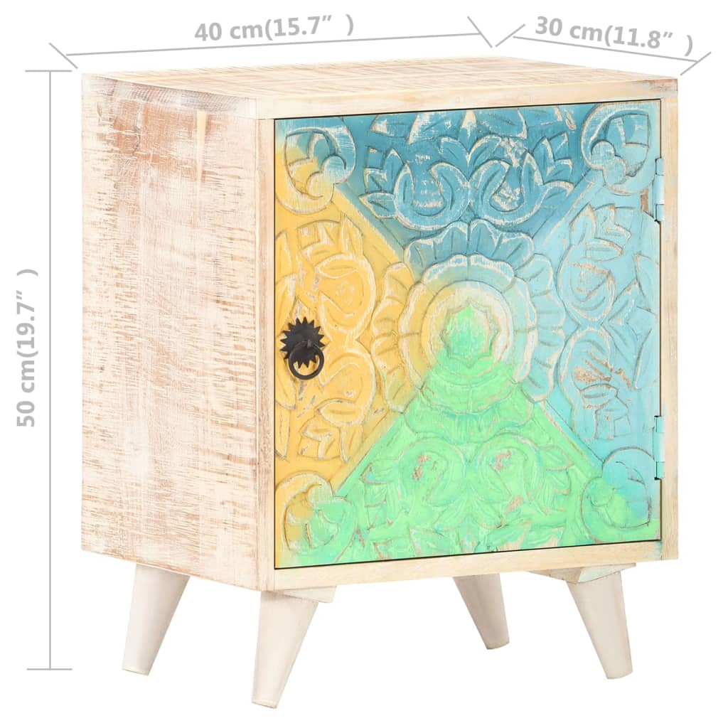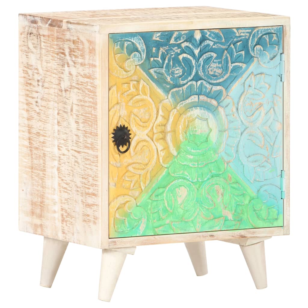 Our wooden bedside cabinet with carved patterns makes a timeless addition to your interior decor. This nightstand is made of solid acacia wood with a natural finish, which is a hardwood with dense grains. Rough acacia wood has the strength to bear the weight, and also stand the wear and tear of time. With multicoloured carved patterns, this beautifully-designed bedroom cabinet is stable, durable and eye-catching. Its legs also add to its sturdiness. The sturdy top of the cabinet is ideal for placing decorative items such as vases or potted plants. The cabinet with 1 door provides ample storage space for keeping your notepads, books, and various other items neatly organised. Important note: The colours and grains vary from piece to piece, making each piece unique. The delivery is random, ensuring the exclusivity and individuality of your product.