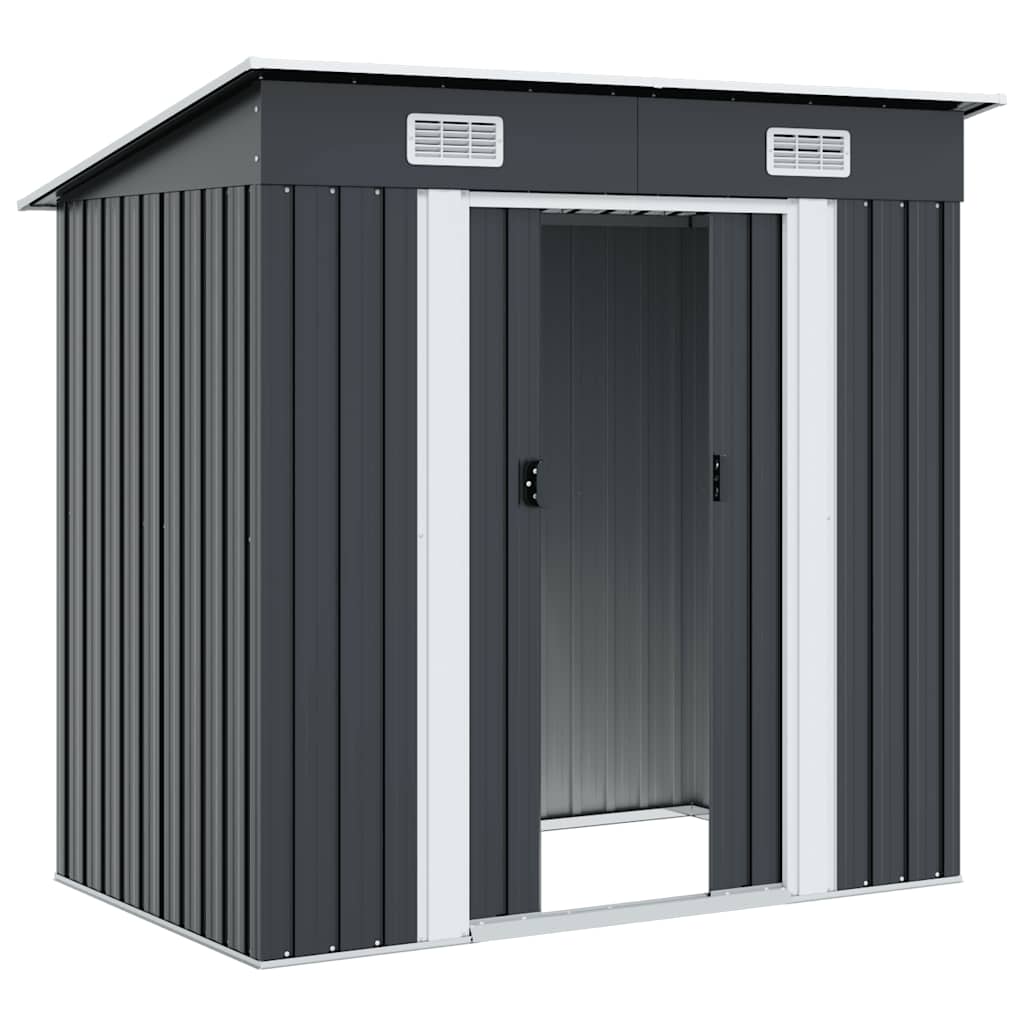 This metal storage shed will be a great addition to any backyard, lawn, or garden area. It is ideal for storing garden tools, lawn care equipment, household items, and much more! Practical design: This storage shed has 2 vents in the front, ensuring excellent ventilation. The double sliding doors in the front allow easy entry and exit.Durable material: The galvanised steel construction, along with a zinc-coated finish, makes it durable and strong, so it won't corrode or be affected by extreme weather.Easy to assemble: The pre-cut, pre-drilled parts and the included instruction manual ensure fast and easy assembly.Good to know:To prevent damage from heavy snow buildup, we recommend clearing the roof regularly during winter.