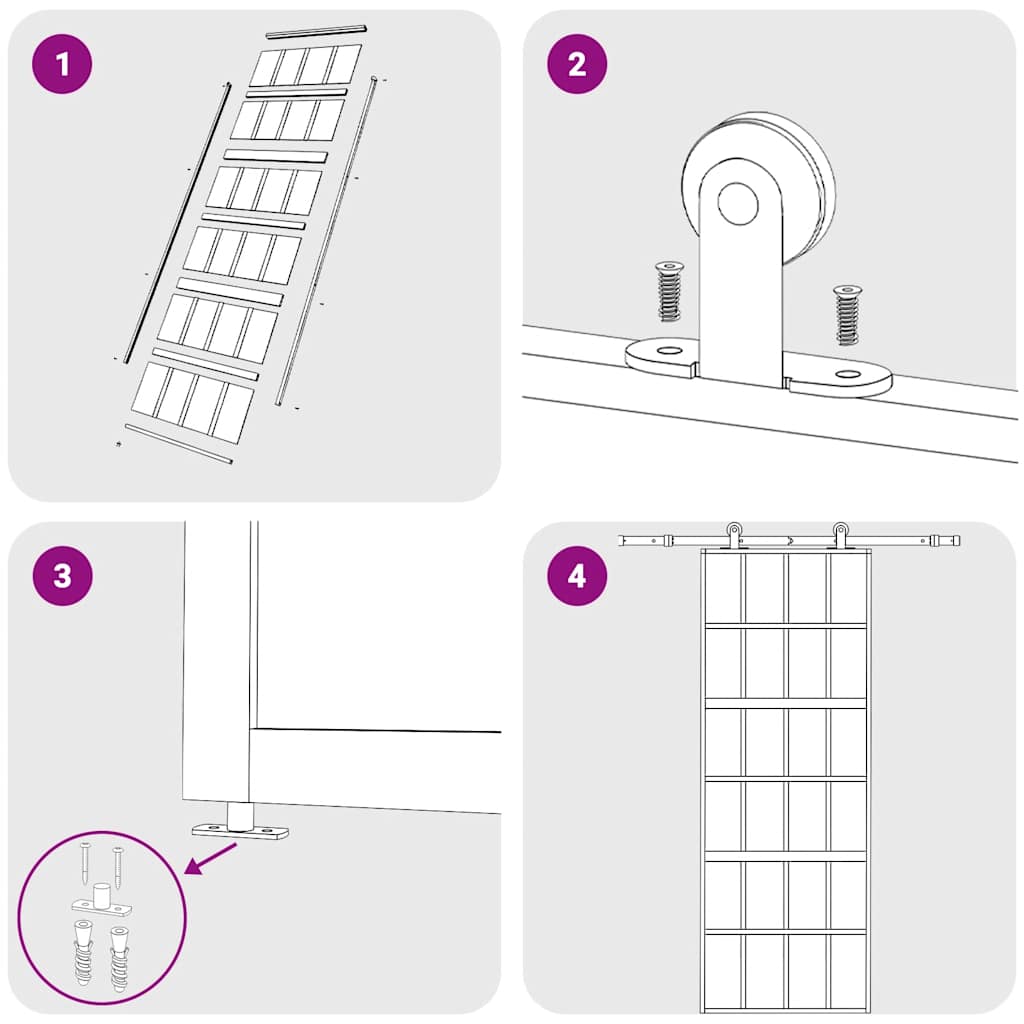 Create a graceful transition from one space to another with this sliding door! Frosted glass panels: These frosted glass panels allow some light to pass through, creating a bright living area while also ensuring privacy.Robust metal frame: This sliding barn door has an aluminium frame for durability and stability.Safe and quiet sliding: Thanks to the doorstop, the internal sliding door can be opened and closed quietly by a buffer mechanism.Slim design: The slim frame design gives the sliding glass door a modern and minimalist appearance. Good to know:The door can only be mounted in combination with sliding door hardware kits. You can find the matching sliding door hardware kits in our shop.For the installation way, you can check our installation manual of the door and sliding hardware kits.