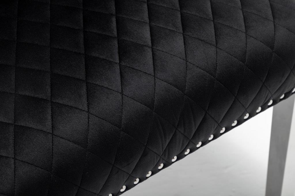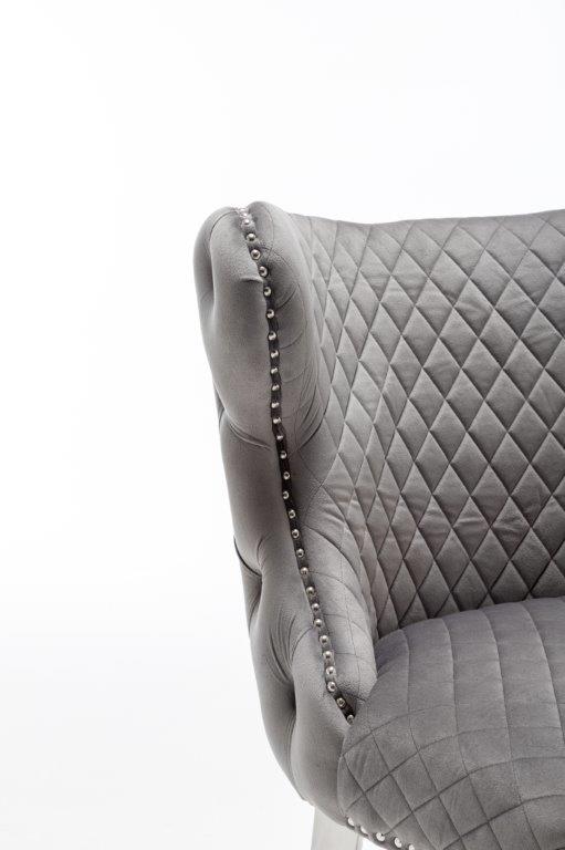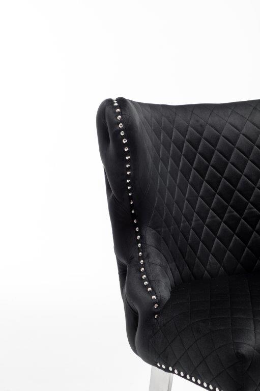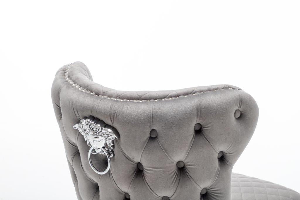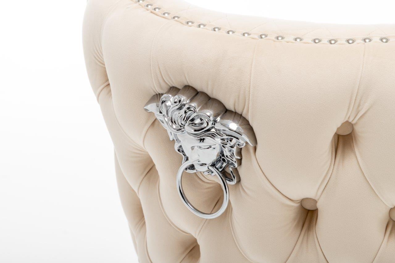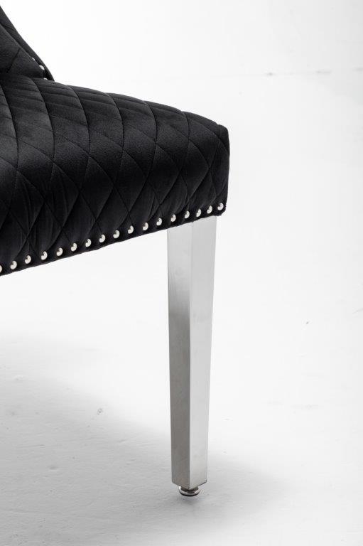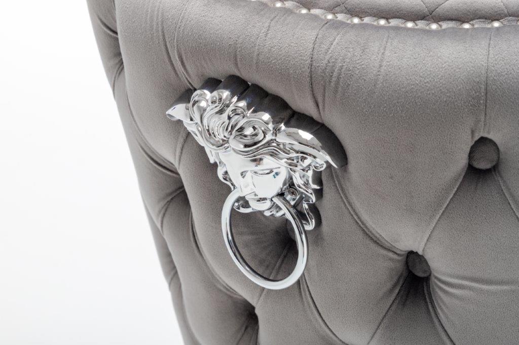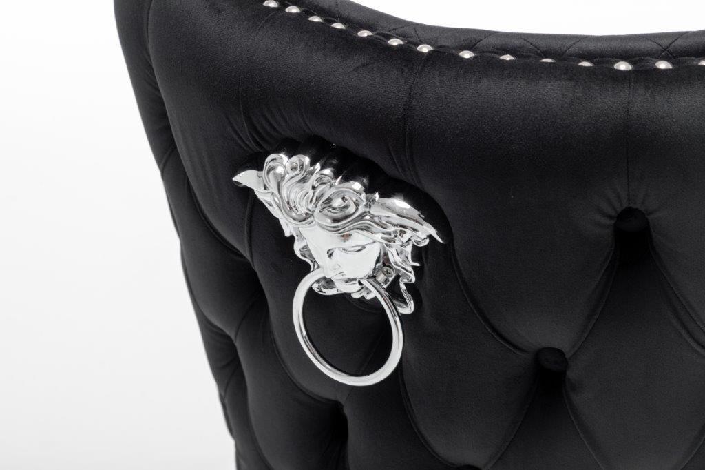 The Medusa collection is sure to make a bold statement with its sensational Medusa (Medusa is Trade mark registered to Guru Kirpa (UK) Ltd.) Knocker back design and chrome polished steel legs. The padded seating and comfortable curved back rest is wrapped in a deluxe, soft, quilted and plush luxury velvet with a studded design and button detailing. The beautifully designed chair can be used in any interior setting whether it be the bedroom, dining or living room. More features: