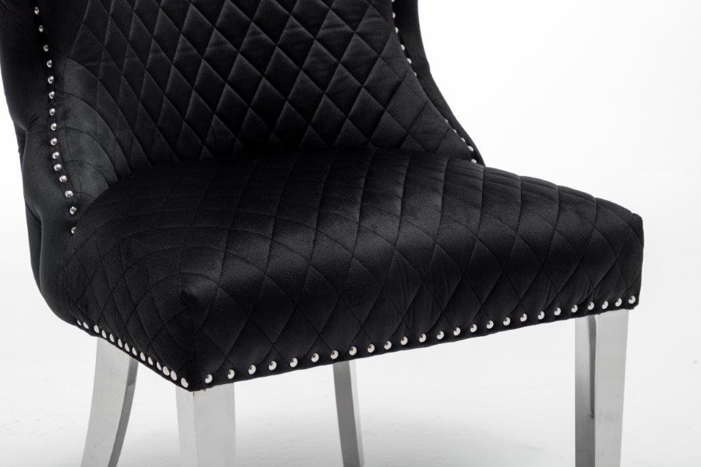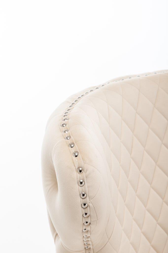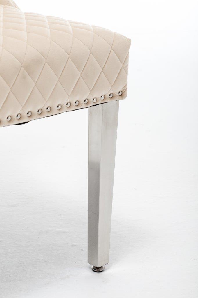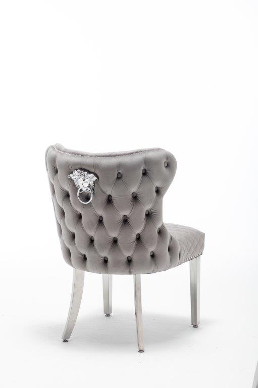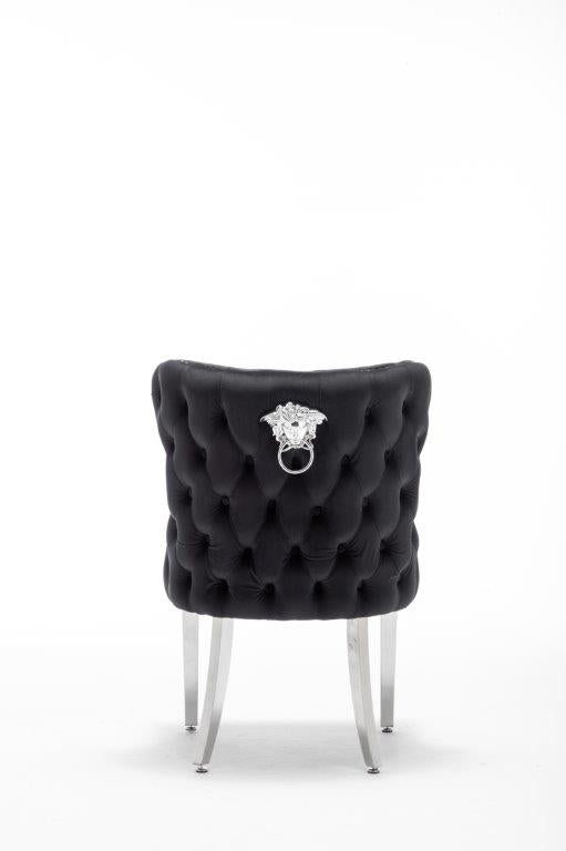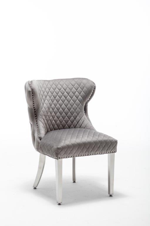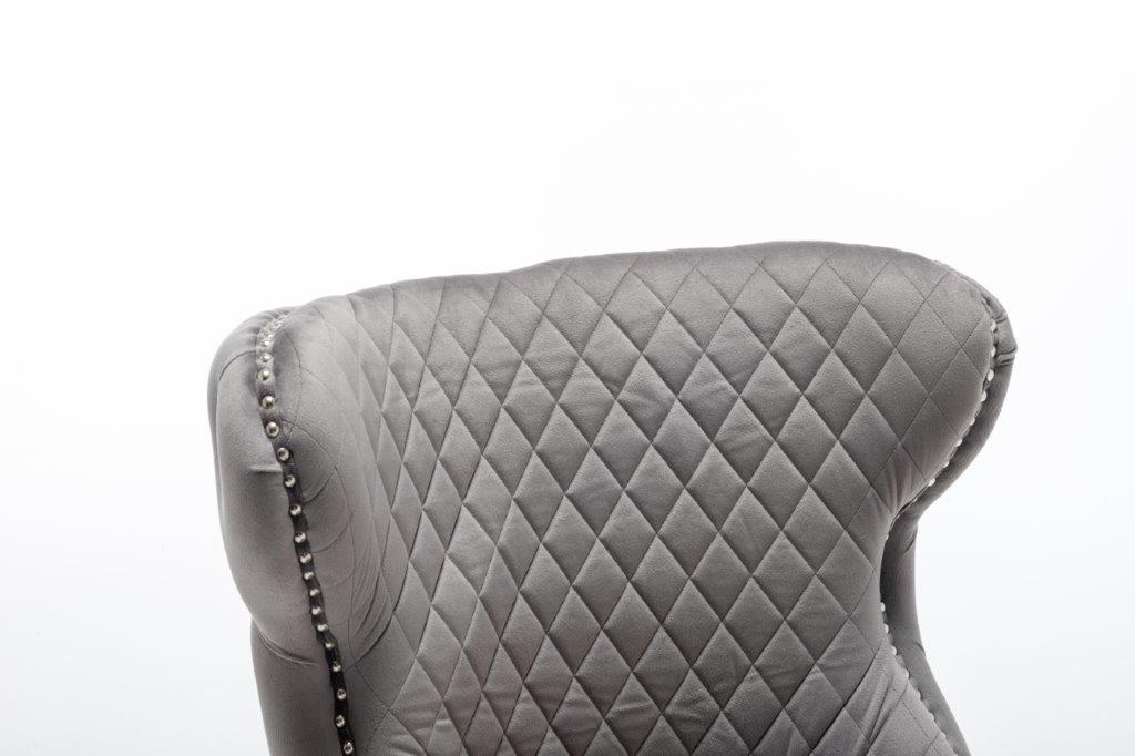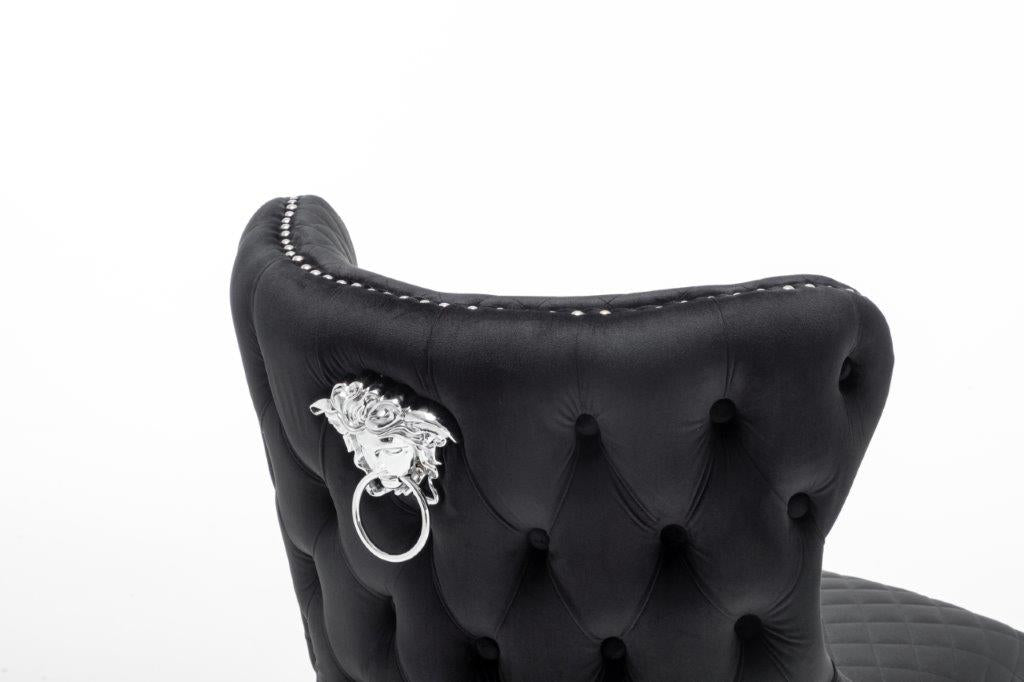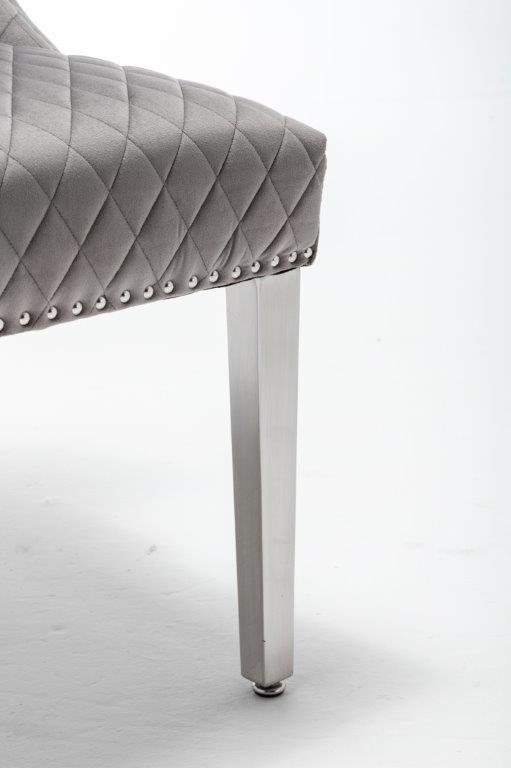 The Medusa collection is sure to make a bold statement with its sensational Medusa (Medusa is Trade mark registered to Guru Kirpa (UK) Ltd.) Knocker back design and chrome polished steel legs. The padded seating and comfortable curved back rest is wrapped in a deluxe, soft, quilted and plush luxury velvet with a studded design and button detailing. The beautifully designed chair can be used in any interior setting whether it be the bedroom, dining or living room. More features: