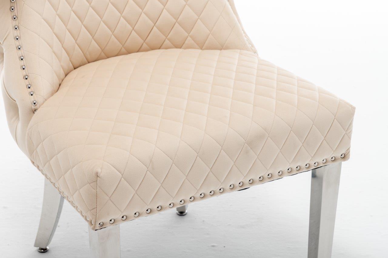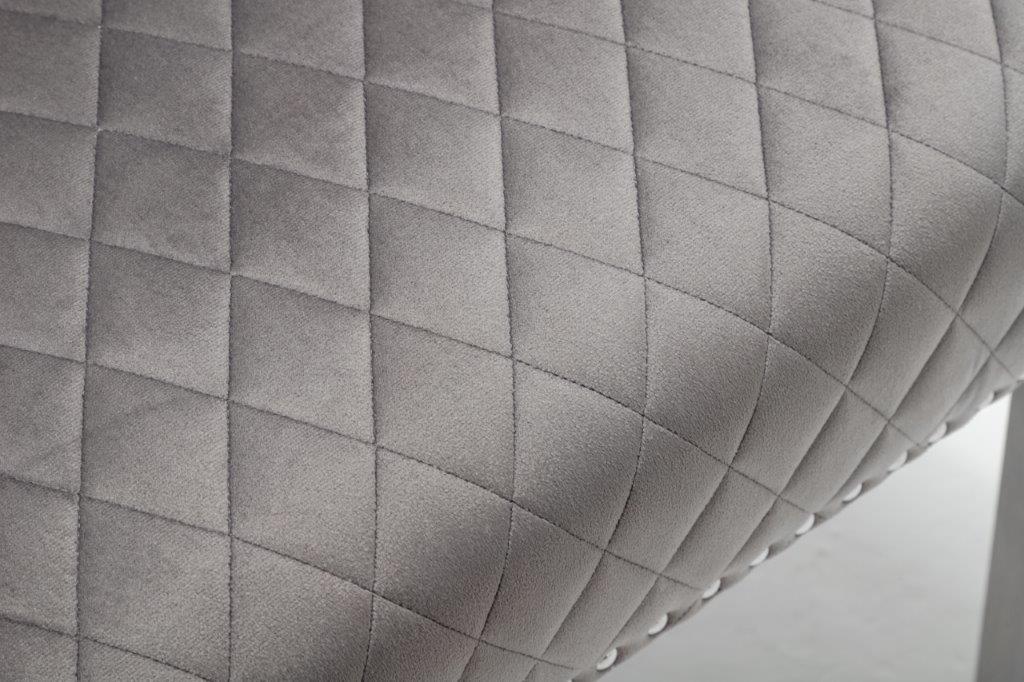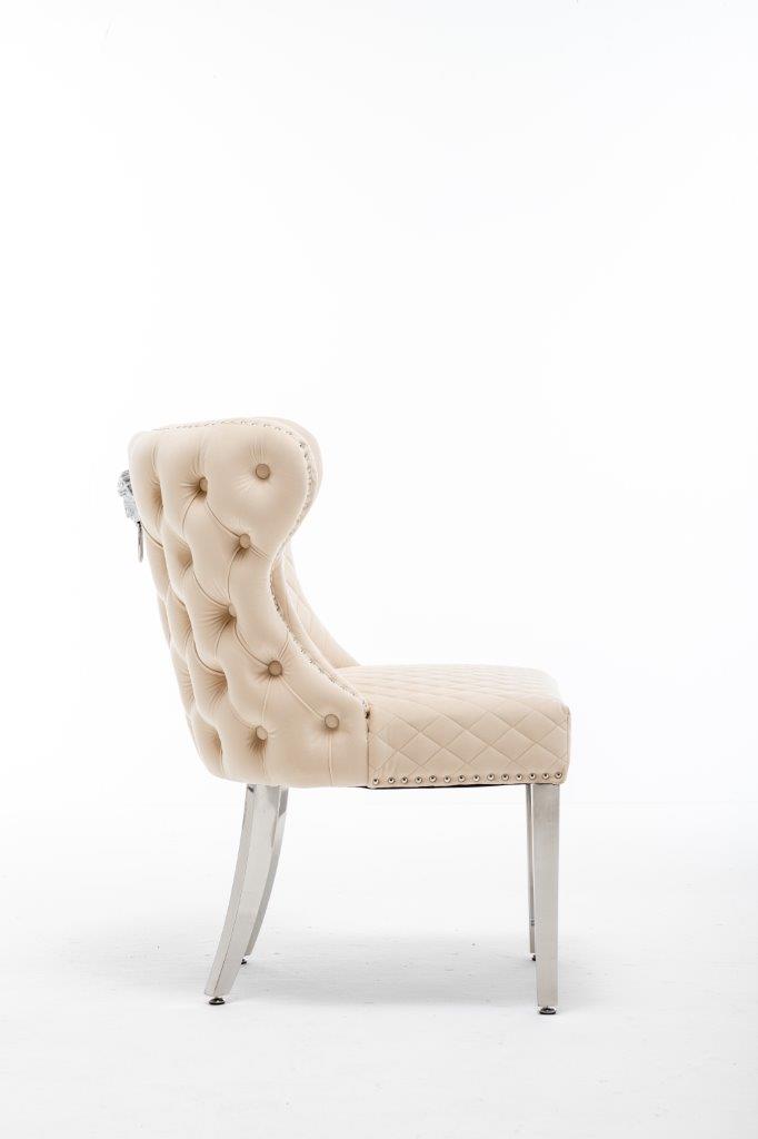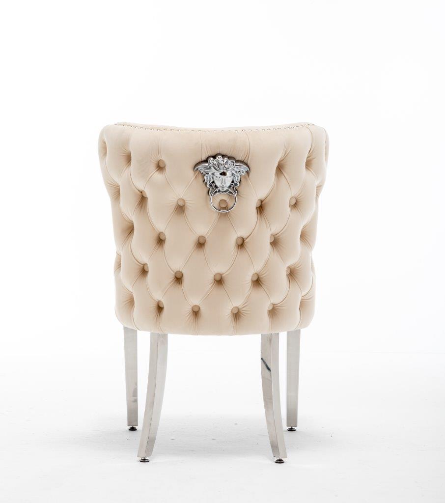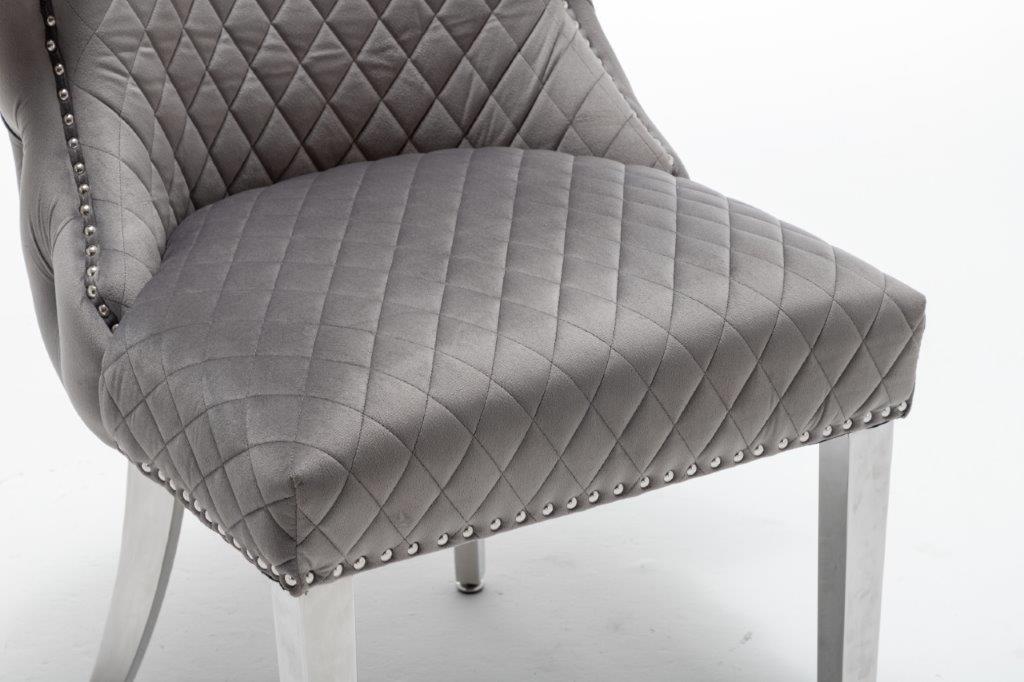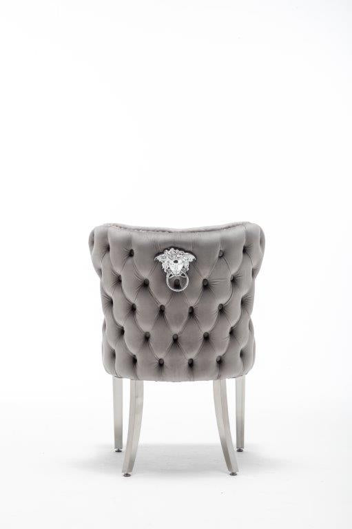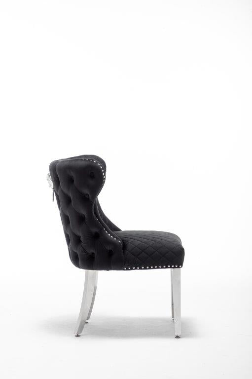 The Medusa collection is sure to make a bold statement with its sensational Medusa (Medusa is Trade mark registered to Guru Kirpa (UK) Ltd.) Knocker back design and chrome polished steel legs. The padded seating and comfortable curved back rest is wrapped in a deluxe, soft, quilted and plush luxury velvet with a studded design and button detailing. The beautifully designed chair can be used in any interior setting whether it be the bedroom, dining or living room. More features:
