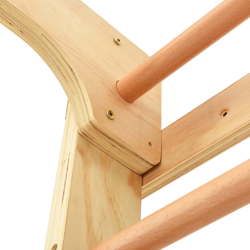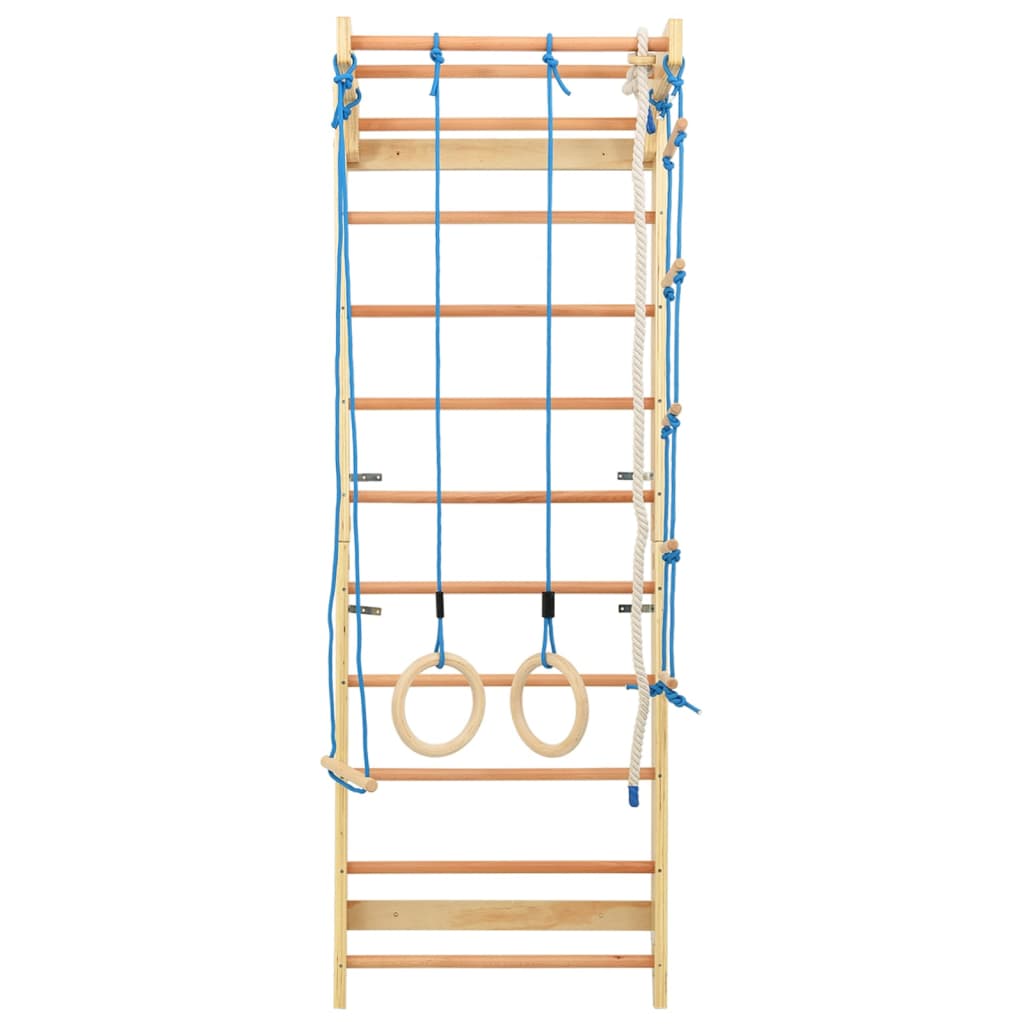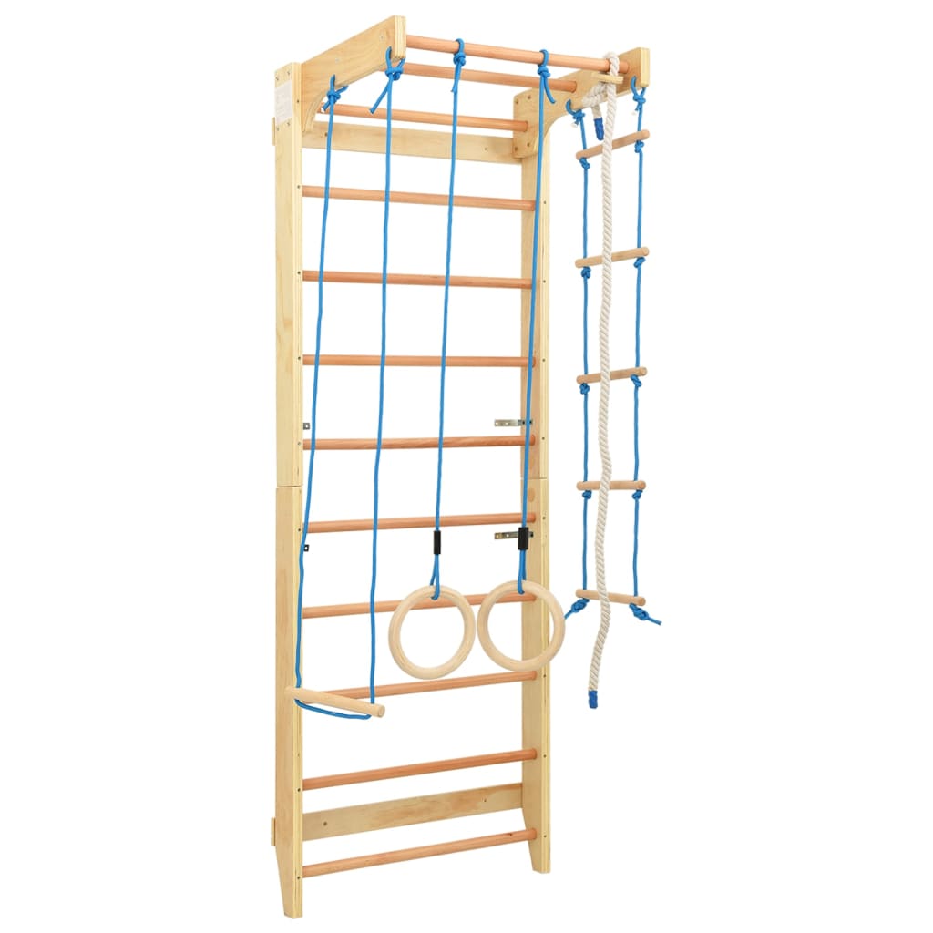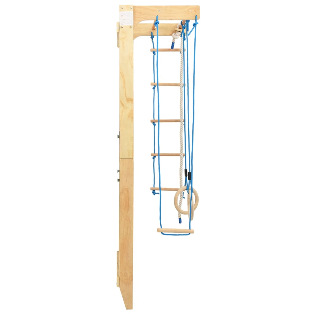 With this durable indoor climbing playset at home, you can always enjoy exploring fun-filled activities that will keep children entertained for hours, no matter it's raining or shining. You will fall in love with the many play features like: wooden ladder, rope ladder, climbing rope and gymnastic rings. With a compact design, the indoor playground doesn't take much space, but allows quality physical exercise, active play or just fun with friends. The climbing playset is made of sturdy rubberwood and plywood and supplied with quality fittings for maximum safety and durability. The playset can be securely mounted to the wall in your house or apartment and provides stability for climbing and play.
