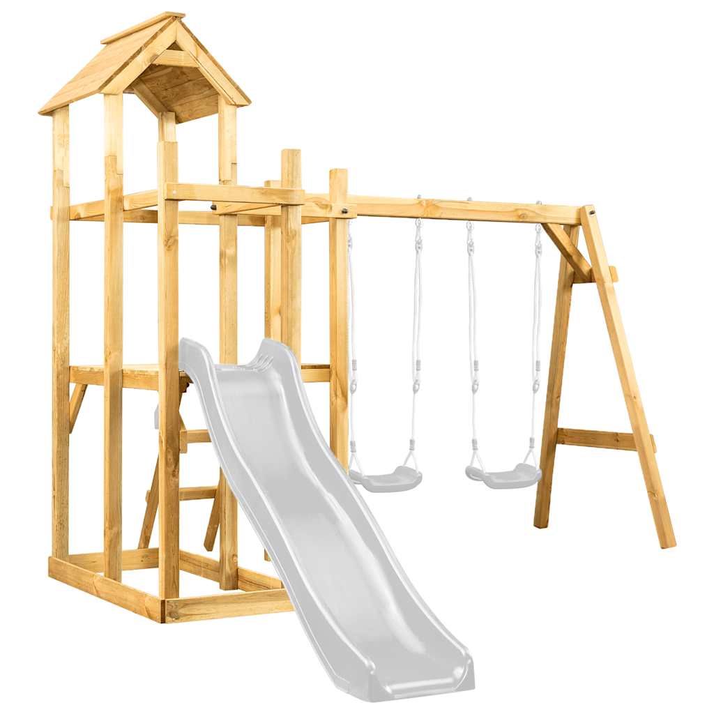 This wooden play tower offers many play options when combined with a slide, a climbing wall, or swings and impresses your children with its great details.Impregnated wood: Solid pinewood is known for its strength and durability. Its straight grains and distinctive knots contribute to its rustic charm. It has been impregnated with a preservative solution and undergone autoclave treatment, enhancing its resistance to decay and weathering.Stable wooden frame: The wooden frame of the garden playhouse ensures sturdiness and stability.Practical design: This outdoor playground can be combined with a slide, a climbing wall, or swings freely to create your own play area. Good to know:For assembly, a drill is needed. To ensure a sturdy structure, some of the holes are predrilled and others still have to be drilled during assembly.Delivery only contains the wooden tower. You can check our shop for the slide, ladder and swings.