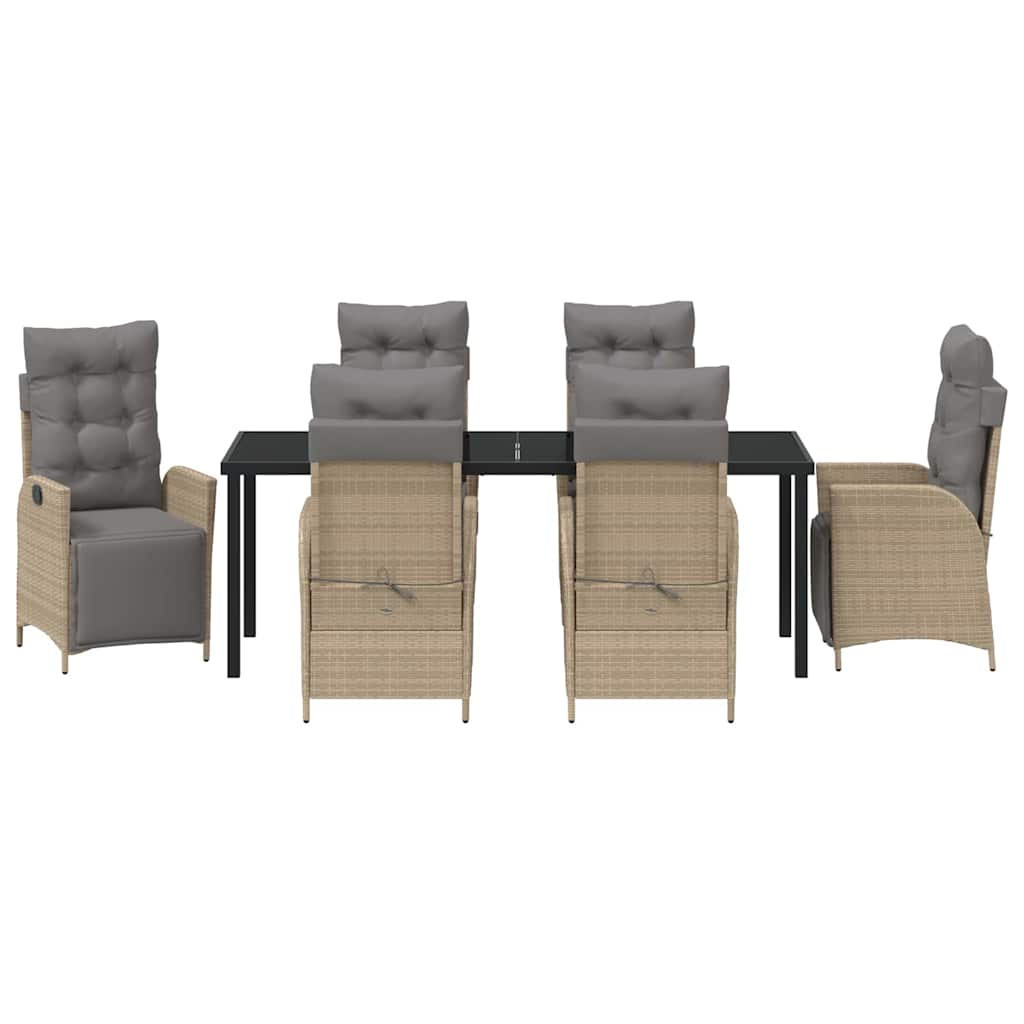 This adjustable garden dining set takes outdoor lounging and dining to the next level with its sleek and modern style, all about clean lines and keeping it simple. Perfect for gardens and terraces, this set brings a contemporary feel to any outside area, making it ideal for summer get-togethers and family meals. The black woven texture pairs nicely with the powder-coated metal, giving you a stylish and durable set-up that can handle whatever the weather throws at it, while still keeping comfy for all. Premium Materials: Crafted from poly rattan and powder-coated steel, this set is all about weather resistance and durability. The poly rattan has a nice woven texture that’s just right for outdoor vibes, and the powder-coated steel gives you a solid frame that stands up to changing seasons. Adjustable Features: Enjoy your comfort with adjustable footrests and a handle that lets you change the levels easily. This flexibility makes for a cosy experience whether you’re dining or just lounging about. Components & Design: The reclining chairs have removable seat cushions, made with comfy polyester and handy zipper closures for easy cleaning. The tempered glass top gives you a sleek surface that ties in with the modern style of the set. Versatile Use: Perfect for any garden or terrace, this set is ideal for outdoor dinners or just chilling out in the sun. Its modern look fits in well with all sorts of decor styles, making it a hit with anyone into contemporary design. Easy Care: To keep this set looking sharp, just use a cover when it’s not in use, and go for machine-washable covers for the cushions to make upkeep super easy. This way, it stays visually appealing with minimal fuss.