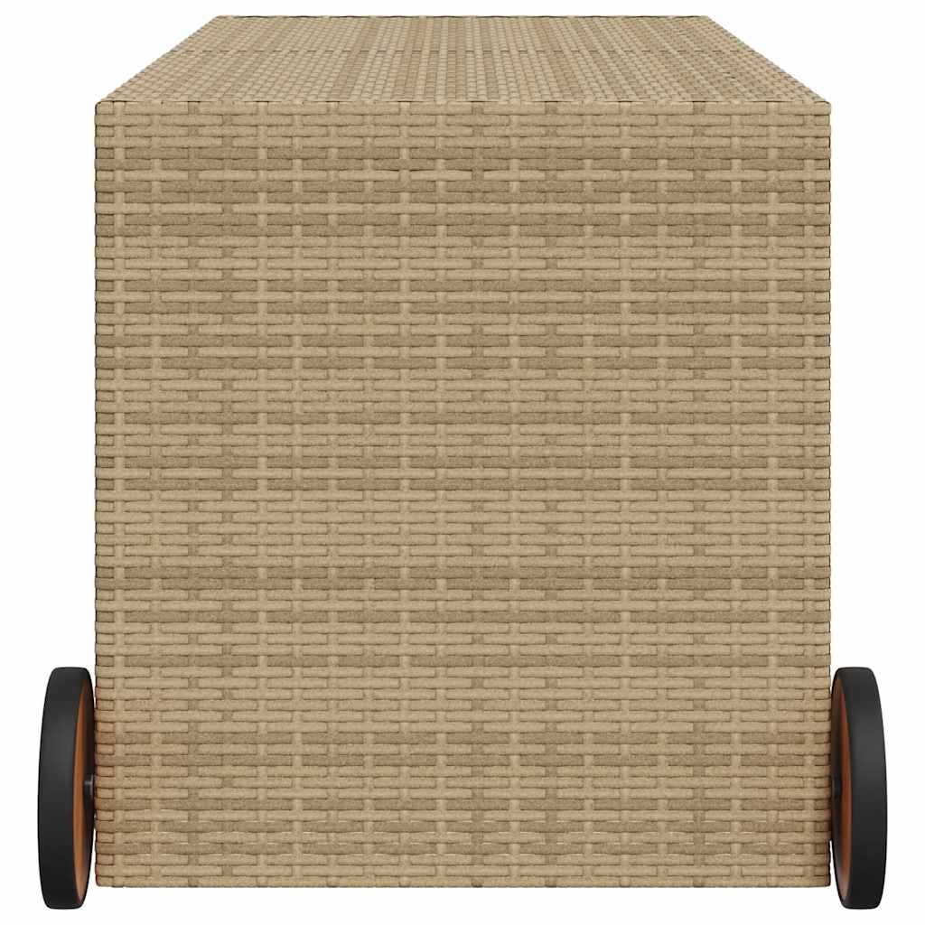 This garden storage box is ideal for storing your cushions, pillows, blankets, and other items in the garden or on the patio. Durable material: PE rattan, also known as poly rattan, is a strong, low-maintenance synthetic material that looks like natural rattan. It's lightweight, easy to clean, and commonly used for outdoor furniture due to its durability and weather-resistant properties.Storage function with water-resistant bag: The garden furniture features a water-resistant bag for storing cushions and other items. The inner bag can be securely fastened to the outdoor furniture with hook-and-loop fasteners for added stability.Safe and easy to open and close: The gas spring makes it easy to open the lid and keeps it from slamming shut or trapping fingers.Easy to move: The outdoor storage box is designed with 2 wheels and a handle on the one side for easy transport.Robust and stable frame: The powder-coated steel frame ensures that the garden furniture is strong and stable for daily outdoor use. Good to know:To make sure your outdoor furniture stays beautiful, we recommend protecting it with a waterproof cover.