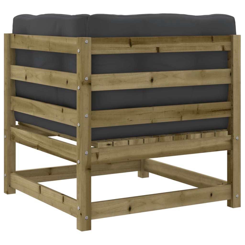 These wooden garden sofas with cushions will make a great addition to your garden, terrace, or patio for chatting with family and friends or just enjoying the weather. Impregnated wood: Solid pine wood is a beautiful natural material. Pine wood has a straight grain, and the knots give the material its signature, rustic look. Impregnation is a preservation process that is carried out by using autoclaves. The pressure-treatment increases resistance to decay and weather.Comfortable seat experience: The backrest and the tickly-padded cushions make the garden sofa chair more comfortable to sit on.Slatted design: The slatted design of the outdoor sofa effectively prevents water from pooling, ensuring that the seat remains dry and free from potential rot.Modular design: This patio sofa features a modular design, making it completely flexible and easy to move around to suit any setting. You can combine it with other modular segments available in the drop-down menu to create your own personal garden lounge set configurations! Good to know:To make sure your outdoor furniture stays beautiful, we recommend protecting it with a waterproof cover.