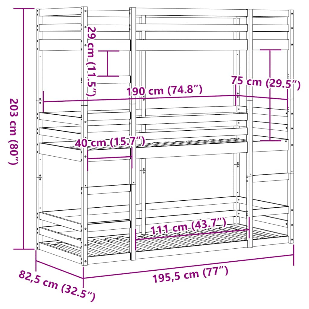 This wooden triple bunk bed is elegant and functional, making it a perfect addition to any room with limited space. Robust and stable: Solid pinewood is known for its strength and durability. Its straight grains and distinctive knots contribute to its rustic charm.Safety guardrails: The triple sleeper comes with safety guardrails on all 4 sides, so you can sleep without worrying about falling off.Practical ladder: The ladder of this bunk bed makes sleeping on the upper floor easier and safer and offers you sufficient safety and stability.Full use of space: This triple sleeper bunk bed uses vertical space efficiently and can be easily converted into separate single and platform beds. Perfect for multi-headed families or spontaneous overnight guests, this triple bed meets versatile sleeping needs. Good to know:The delivery includes bed frames only. The mattresses are not included. You can check our shop for matching mattresses.Screws and plugs for inside the wall are not included. We advise to find and use screws and plugs suitable specifically for your walls. If you're not sure, you can consult with a professional. Please read and follow each step of the instructions.