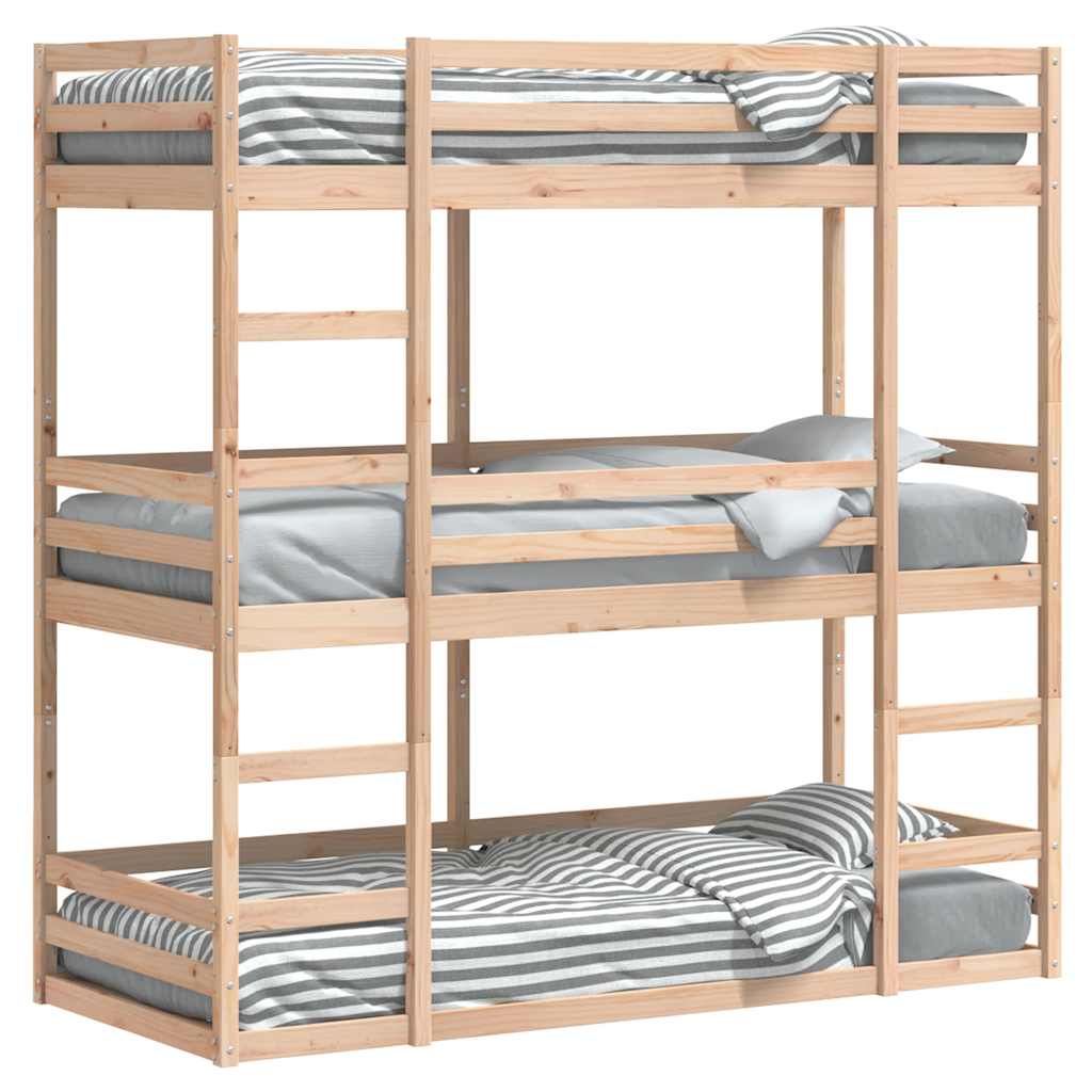 This wooden triple bunk bed is elegant and functional, making it a perfect addition to any room with limited space. Robust and stable: Solid pinewood is known for its strength and durability. Its straight grains and distinctive knots contribute to its rustic charm.Safety guardrails: The triple sleeper comes with safety guardrails on all 4 sides, so you can sleep without worrying about falling off.Practical ladder: The ladder of this bunk bed makes sleeping on the upper floor easier and safer and offers you sufficient safety and stability.Full use of space: This triple sleeper bunk bed uses vertical space efficiently and can be easily converted into separate single and platform beds. Perfect for multi-headed families or spontaneous overnight guests, this triple bed meets versatile sleeping needs. Good to know:The delivery includes bed frames only. The mattresses are not included. You can check our shop for matching mattresses.Screws and plugs for inside the wall are not included. We advise to find and use screws and plugs suitable specifically for your walls. If you're not sure, you can consult with a professional. Please read and follow each step of the instructions.