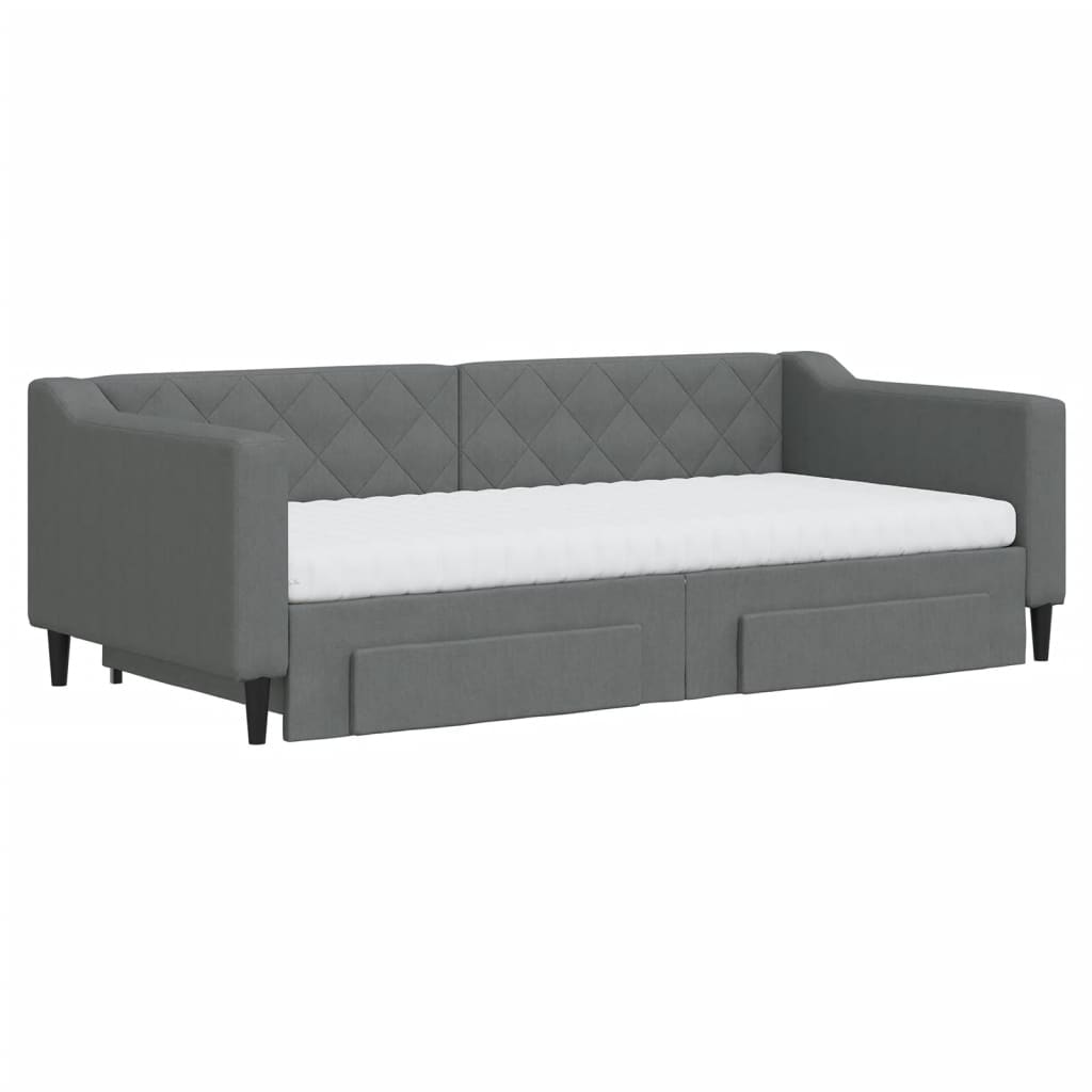 This 2-in-1 daybed with trundle, serving as both a sofa and bed, makes a practical and eye-catching addition to your living room or bedroom. Versatile daybed: The sofa bed functions as a sofa during the day and easily converts into a double bed at night by pulling out the trundle, providing a convenient solution for hosting guests and maximising space. Ample storage space: This guest bed has two drawers with wheels that provide ample space for storing your clothes, socks, toys, cushions, etc. Comfortable foam mattress: This sleeper bed is supplied with two foam mattresses for maximum support and optimum comfort. Durable fabric and solid construction: This day bed sofa has a sturdy frame made of wood and metal and is upholstered in durable and comfortable fabric.