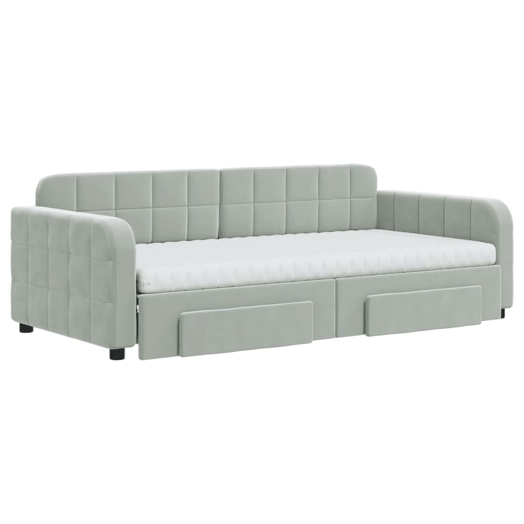 This 2-in-1 daybed with trundle, serving as both a sofa and bed, makes a practical and eye-catching addition to your living room or bedroom. Versatile daybed: The sofa bed functions as a sofa during the day and easily converts into a double bed at night by pulling out the trundle, providing a convenient solution for hosting guests and maximising space.Ample storage space: This guest bed has two drawers with wheels that provide ample space for storing your clothes, socks, toys, cushions, etc.Comfortable foam mattress: This sleeper bed is supplied with two foam mattresses for maximum support and optimum comfort.Soft velvet and solid construction: This day bed sofa has a sturdy frame made of wood and metal and is upholstered in soft and comfortable velvet.