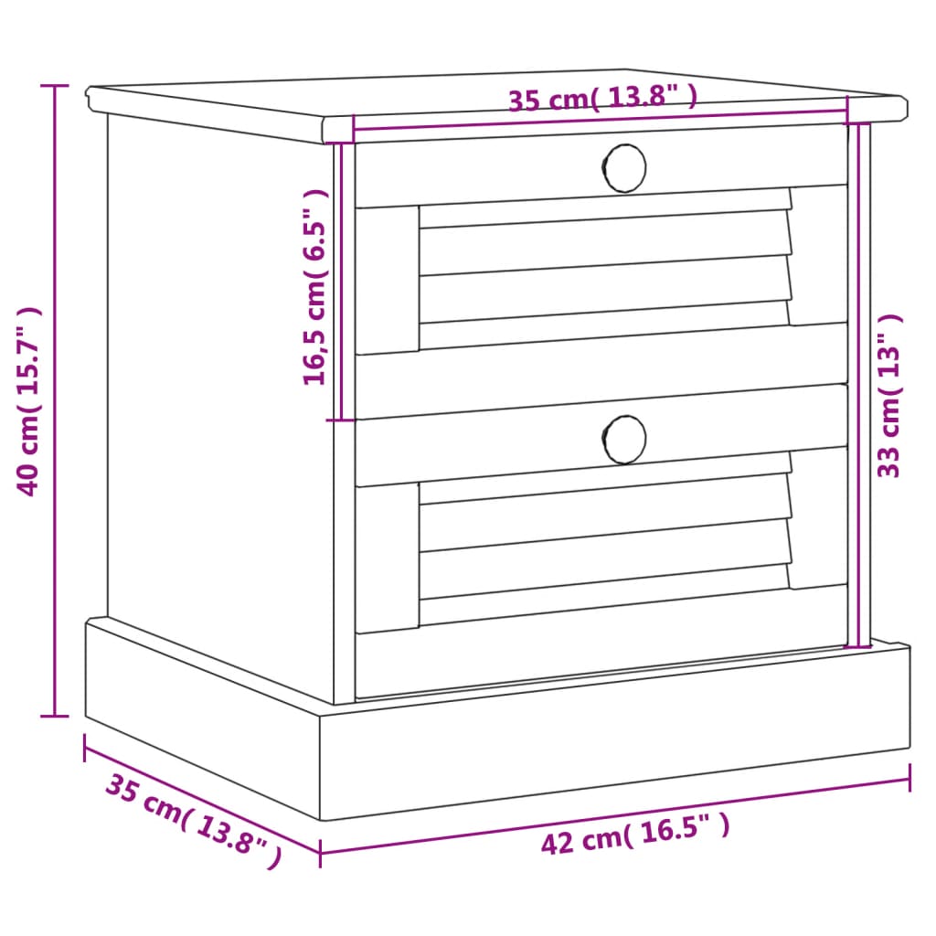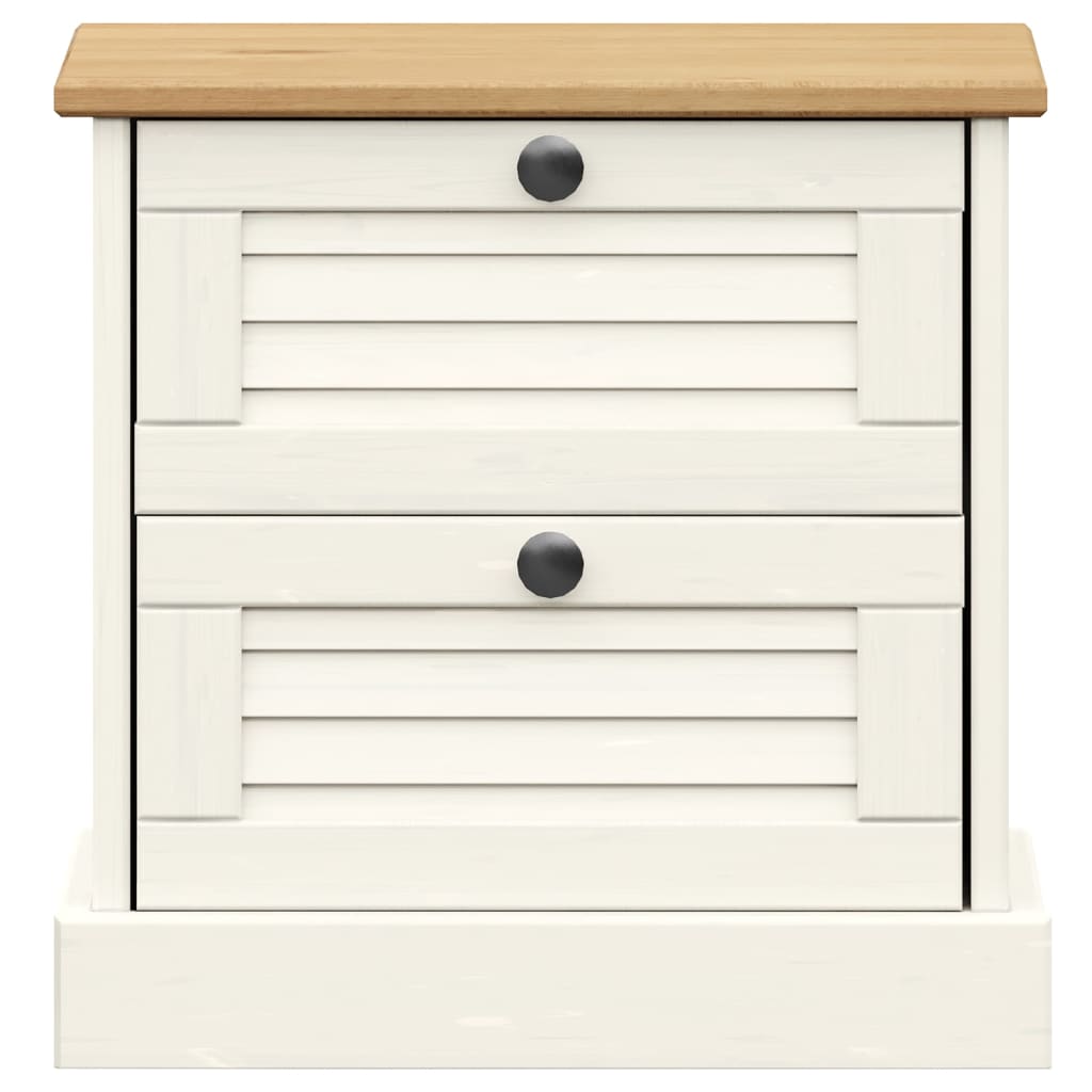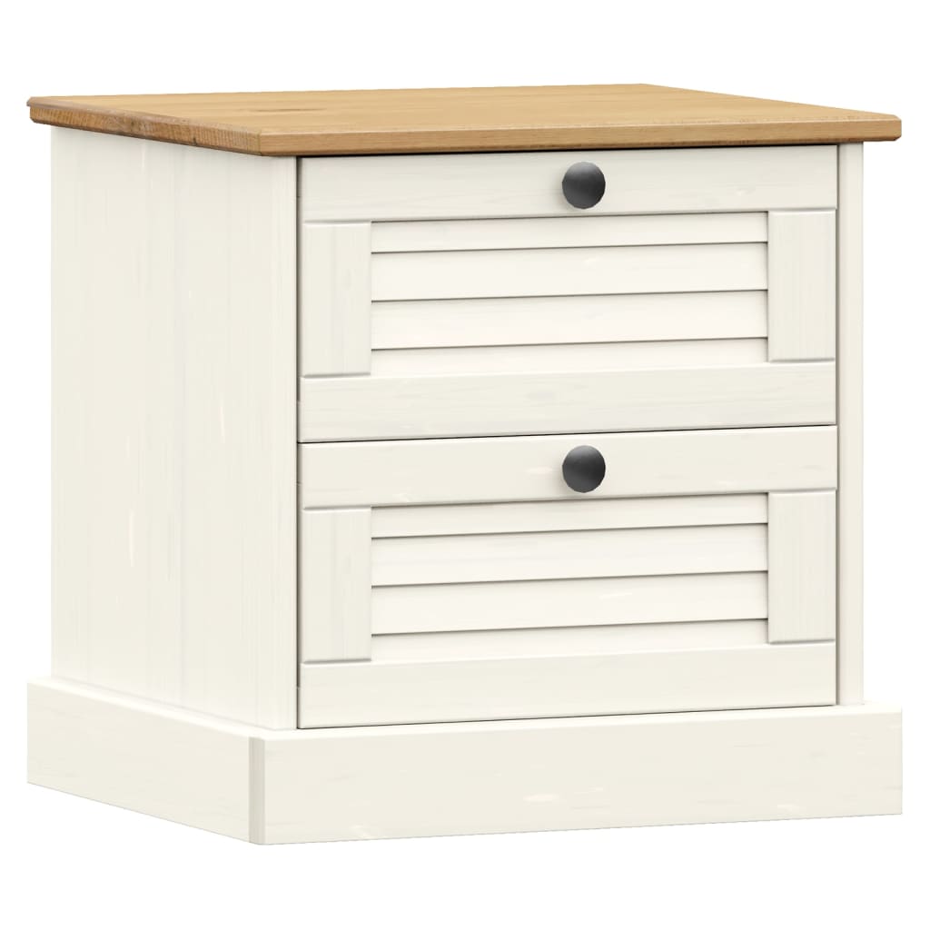With a stylish design, this wooden bedside cabinet fits easily into your bedroom or living room and adds a timeless charm to your interior. Solid pine wood: Solid pine wood is a beautiful natural material. Pine wood has a straight grain, and the knots give the material its signature, rustic look. Made of solid pine wood, the bedside table is durable and sturdy.Ample storage space: The nightstand features 2 convenient drawers, helping keep your essentials organised and close at hand.Easy to maintain: The end table is easy to clean with a damp cloth and requires less maintenance.Metal knobs: The bed cabinet comes with metal knobs that make the drawers easy to open and close while also adding to extra beauty.