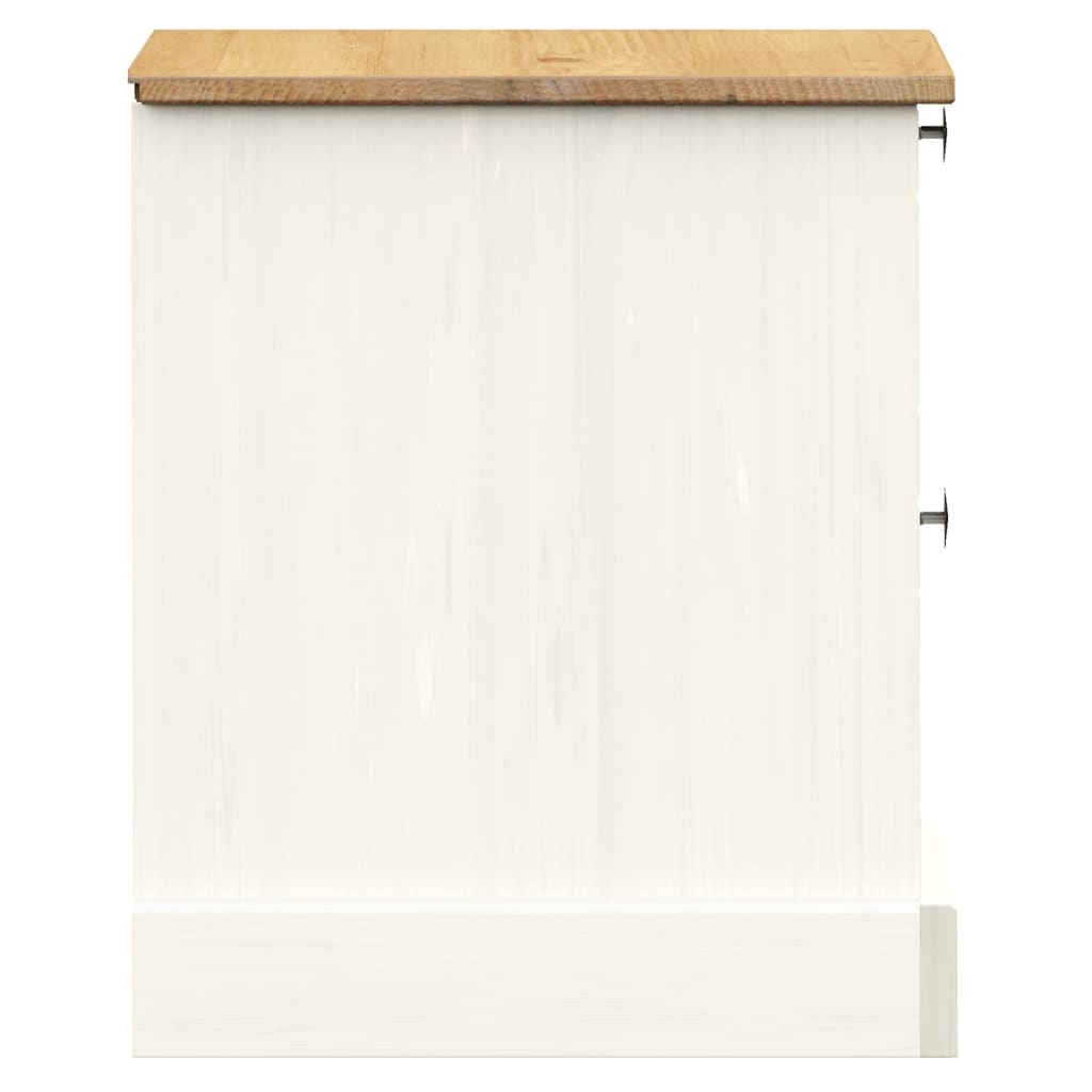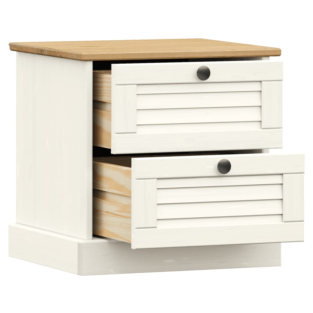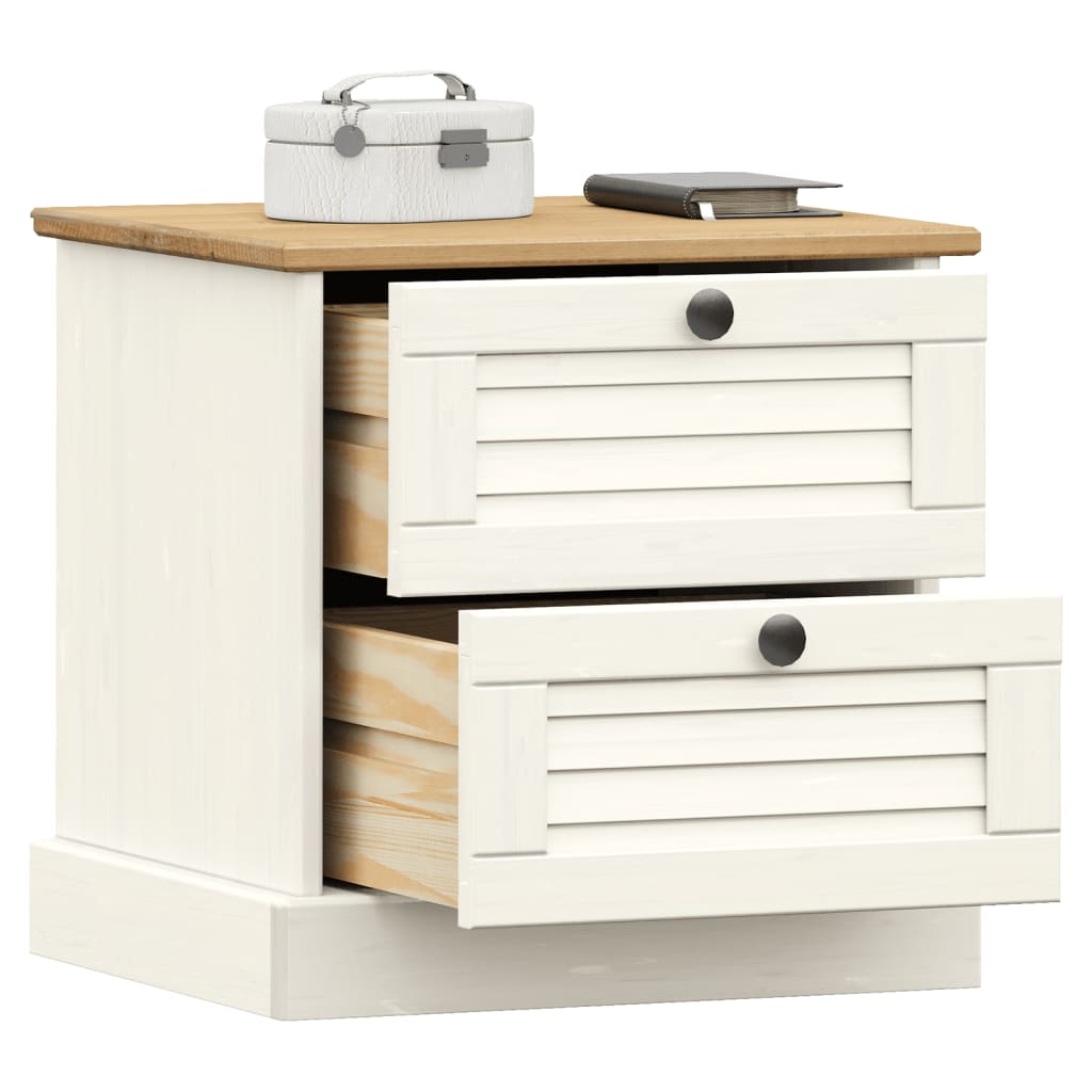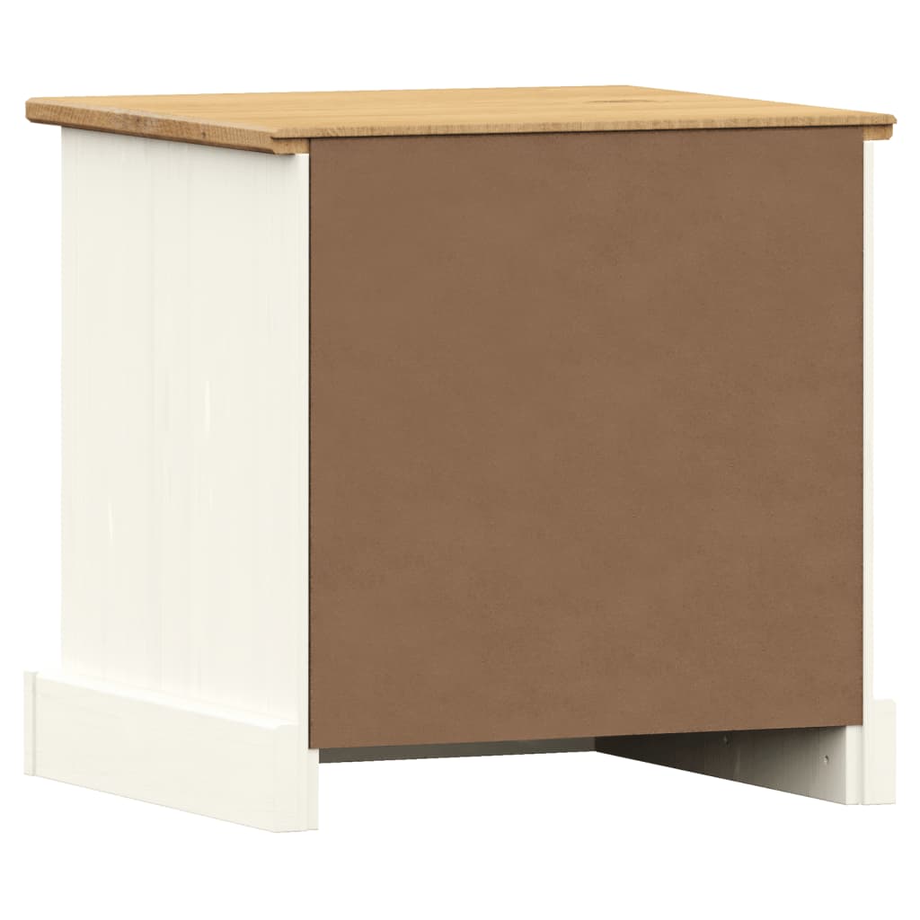 With a stylish design, this wooden bedside cabinet fits easily into your bedroom or living room and adds a timeless charm to your interior. Solid pine wood: Solid pine wood is a beautiful natural material. Pine wood has a straight grain, and the knots give the material its signature, rustic look. Made of solid pine wood, the bedside table is durable and sturdy.Ample storage space: The nightstand features 2 convenient drawers, helping keep your essentials organised and close at hand.Easy to maintain: The end table is easy to clean with a damp cloth and requires less maintenance.Metal knobs: The bed cabinet comes with metal knobs that make the drawers easy to open and close while also adding to extra beauty.