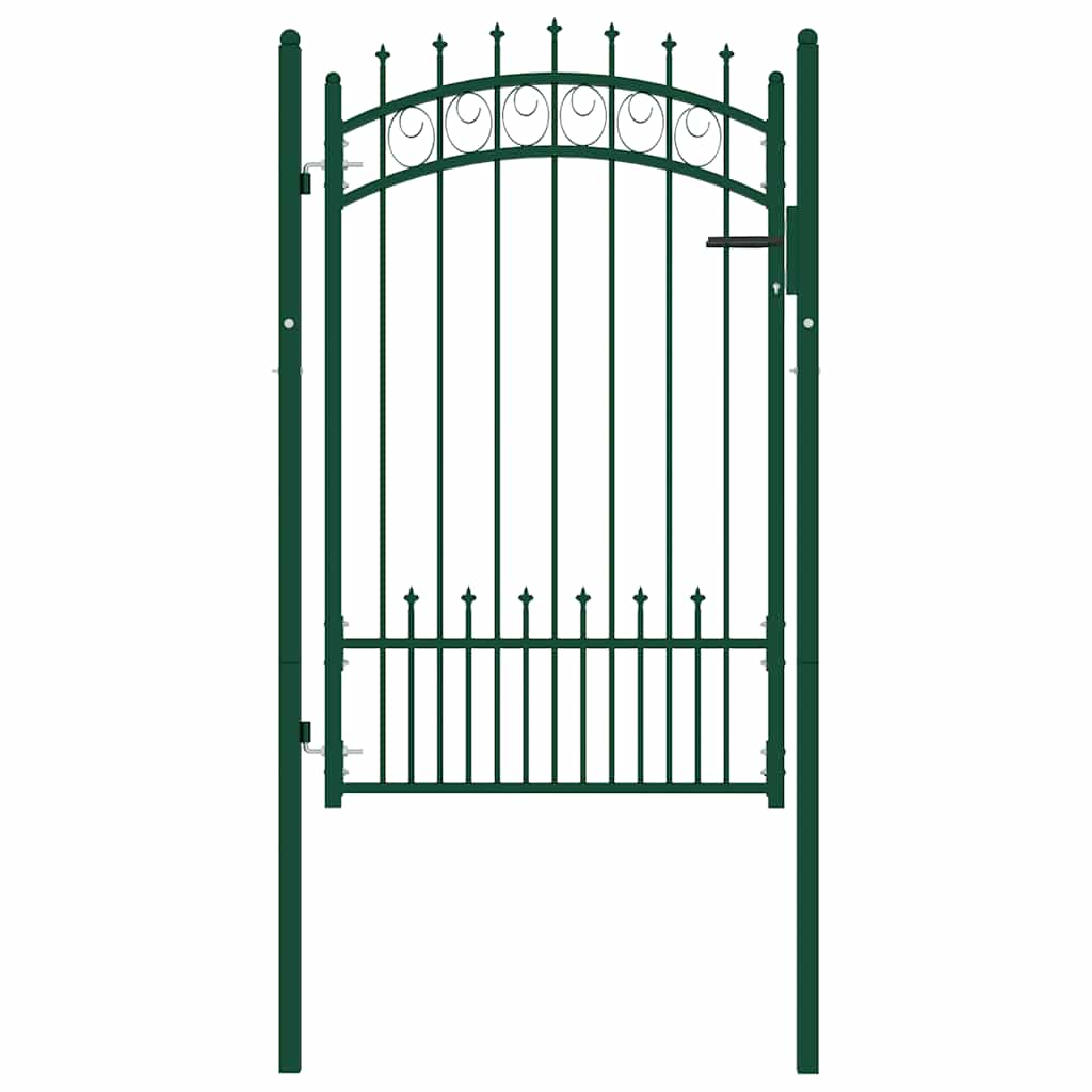 This fence gate forms a practical security barrier for your garden, patio or terrace. Manufactured from heavy-duty steel, the fence gate has a sturdy construction and has been powder coated against rust and corrosion. With the vertical bars featuring spikes and strong horizontal brace as the reinforcement, this garden gate provides a high degree of security. The arched top design adds to its elegance. It comes with two solid posts along with sturdy hinges for easy installation, and a locking system with three matching keys is also included in delivery.