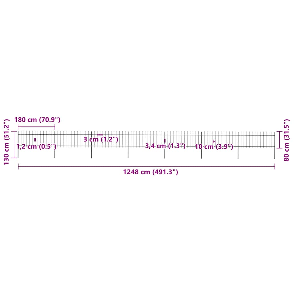 Create an elegant fence around your garden, home, or walkway with our garden fence! Our decorative steel garden fence, consisting of 7 fence panel and 8 posts, has a total length of 11.9 metres. It will form a sturdy, safe and maintenance-free perimeter barrier for your garden, home, or business property. With vertical bars topped with spear ends and strong horizontal brace as reinforcement to the frame, our garden fence will provide a high degree of security. Manufactured from heavy-duty, powder-coated steel, the outdoor fence is exceedingly stable, sturdy and durable. Thanks to the included mounting materials, the garden fence is easy to assemble. Note: You can buy more sets to make the fence as long as you like.