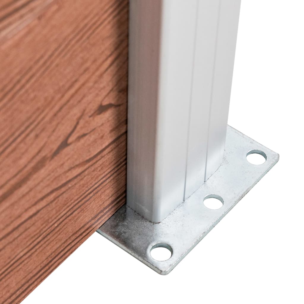 Our fence panel set can be used as garden barrier or residential fence for privacy and security. This WPC fence has a wood grain print on one side and regular print on the other side, so you can choose the design you like best. Our wood-plastic composite panel does not require any additional treatment like oiling or painting. It is very durable and resistant to rot or rust. Thanks to the aluminium top profile, the fence boards can be tightly attached to each other, which increases their rigidity and strength against impact. Designed with the modular system, the fence boards are easy to install and allow you to expand the fence freely. These posts feature three slots, which enable you to assemble the fence in various ways, for example, in a straight line (180 degrees), right angle (90 degrees) or "T"-shape. The multifunctional steel feet can be fixed in two ways. The first one is by screwing them onto a surface, using the supplied anchor screws. The second way is by anchoring them into a cement base, using the ground spike (not included). This fence set is easy to assemble. Delivery includes 9 WPC boards, 1 posts, 1 steel base and 1 aluminium bar.
