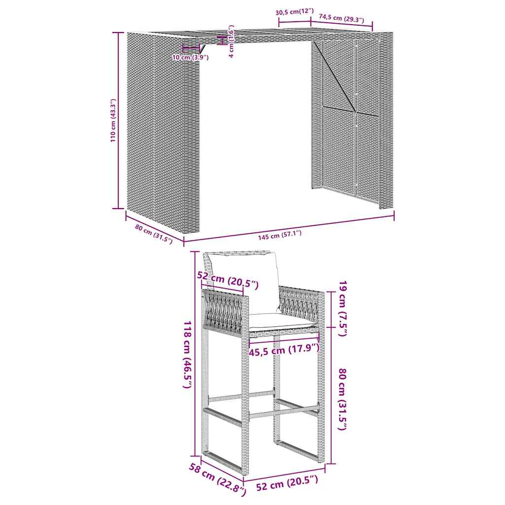 This trendy garden bar set, combining both style and function, is surely meant to be the centrepiece of your garden, patio, and any other living space. Weather-resistant material: PE rattan, also known as poly rattan, is weather resistant and easy to clean. It remains beautiful on the outside for a long period of time. It offers great quality, convenience and an aesthetic look.Comfortable seating: The bar stool is designed with a backrest and a built-in footrest to offer you a comfortable seating experience. The thickly padded seat cushion provides ultimate comfort during your sitting time.Sturdy and stable frame: The powder-coated steel frames make the pub set sturdy and stable for daily outdoor use.Wide applications: The bar table and stool, with its remarkable design, creates a pleasant overall appearance that integrates effortlessly into any environment. Good to know:To make assembly as easy as possible, each product is delivered with a manual.Note:To make sure your outdoor furniture stays beautiful, we recommend protecting it with a waterproof cover.