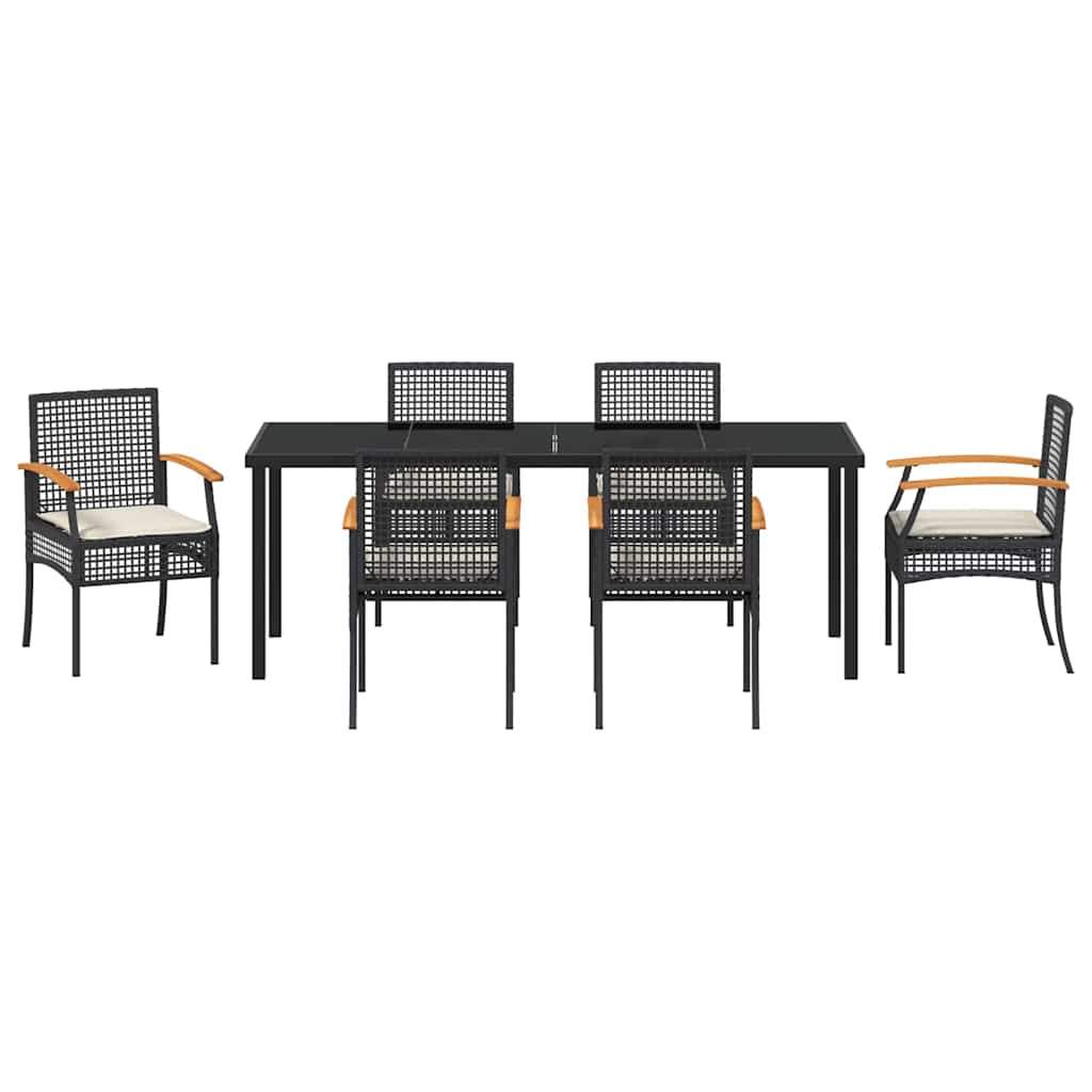 This Modern Garden Dining Set really shows off sophistication with its clean lines and multifunctional design, making it a great fit for modern outdoor spaces. It’s crafted just right for those summer get-togethers in the garden or on the terrace. This set mixes style with practicality, offering a warm welcome for outdoor dining and fun times. Its stylish looks and minimalist approach fit in beautifully with any style, whether you're throwing a party or enjoying a quiet dinner with family. Sturdy Materials: This fab mix of solid acacia wood means your dining set will last through all your summer parties. The natural wood grain adds a bit of elegance, and the poly rattan chairs are comfy and stylish. Plus, the black glass top brings a touch of sophistication to any meal or gathering. Complete Dining Experience: This set has everything you need for a great outdoor time. From comfy chairs made of poly rattan to the sleek glass-top table, each bit is carefully picked for maximum comfort and style. Functional Features: With strong steel legs and frames, each piece in this set promises stability and long life. The solid acacia wood armrests match perfectly with the comfy poly rattan backrests, balancing natural looks and durability for outdoor dining. Convenience and Care: Assembly is easy and only needs two people and a few tools. The care instructions give you the lowdown on protecting your outdoor furniture, suggesting a cover when it’s not in use to keep the weather at bay. Simple Maintenance: The main materials are a doddle to care for. A quick wipe-down keeps things looking sharp, so you're ready for every outdoor occasion.