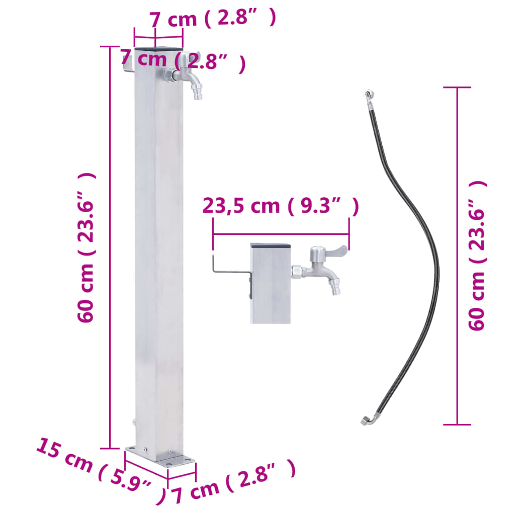 This garden water column together with the faucet is a great addition to your garden while making outdoor watering, washing, or irrigation more convenient. Durable material: The garden water column is made of stainless steel, which is sturdy and durable for long-term use. It also has good resistance to corrosion and rust.Practical hook: The standing faucet is designed with a hook for hanging the hose to deal with hose curling, kinking, and tangling. It has enough height to keep the hose away from the ground which keeps your yard clean and tidy.Stable base: The stainless steel base brings sturdiness and firmness to the faucet column. You can find the expansion screws to fix the column in the ground to add extra stability.Versatility use: The water hose can be attached to the bottom connector to let the water in. The garden faucet is suitable for garden irrigation, car washing, outdoor watering, pet showering, and so on. Good to know:The expansion screw is not included.