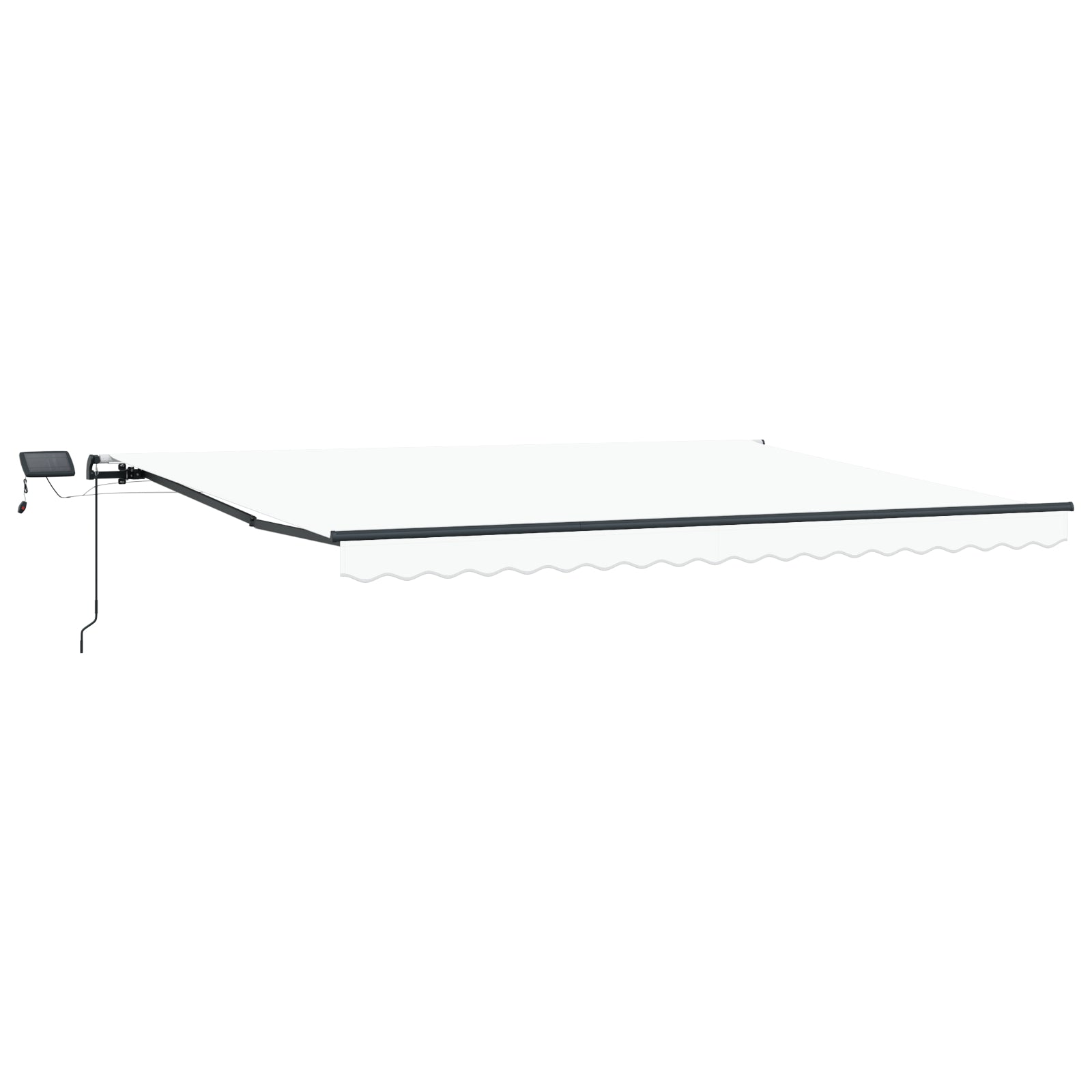 The operating instructions should be read before mounting and using the product. Keep this manual for future reference. This product is intended for outdoor, and domestic as sun protection or decoration only. Never use it for other purposes or modify the product. Don't use it in places that have vibrations, impulsions, or high temperatures such as walls near furnaces. Always wear suitable personal protective equipment when mounting and adjusting the awning. There is a risk of falling when working at great heights, use suitable fall protection. Be careful during installation, crushing and shearing risks may exist. DO NOT remove the safety wraps. These wraps can be removed only after all the assembly steps are finished and all bolts are fastened, and the item is attached to the wall. Serious injury can result from removing the wraps too early. This product and its fixing parts are only suitable for installation on a plain cement wall or stable unrendered brickwork. If the wall/brickwork shows cracks, you have to consult a professional. If your building has an exterior shell (such as insulation, double brick wall, or brick-facing), installation should be taken out by a professional. Never install it in high and windy places, as the sunshade may drop and hurt people. Do not install the awning when damaged or missing parts are found. The external blind shall be retracted in case the wind speed is higher than 28km/h. Before opening the awning, be sure all brackets are mounted securely into wall studs and all bolts are properly tightened ALWAYS CLOSE the awning during high or gosling winds, rain, and when not in use. Failure to do so may result in personal injury and/or property damage. Also, Extension arms are under high tension and can cause serious damage or injury. Children should be supervised to ensure that they do not play with the appliance. Do not use if repair or adjustment is necessary. Do not operate the awning when maintenance, such as window cleaning, is being carried out in the vicinity. Operation in frosty conditions may damage the awning. Don't put heavy stuff on the frame as it may fall down and cause damages. Fasteners too tight or too loose would cause damage to the product or be dangerous to people. Warning: The fabric should not be sunken during operation, otherwise, water will accumulate on it. Please do not unpick and wash the fabric. If you need replace the fabric, please turn to the experts for help. Take care when operating the manual release with the external blind retracted since it may fall rapidly due to weak or broken springs. Danger! Strong spring when opens. DO NOT remove this rope unless you have finished all of the assembly steps with all bolts are fastened and the item is attached to the wall! Warning! Take care when loosening the arms, because they are under tension! A sudden release of the arm of a folding arm awning can cause injury. Warning: The operator’s instruction shall be read before the use of the product. Warning: The operation in frosty conditions may damage the product. External use in buildings and other construction works.