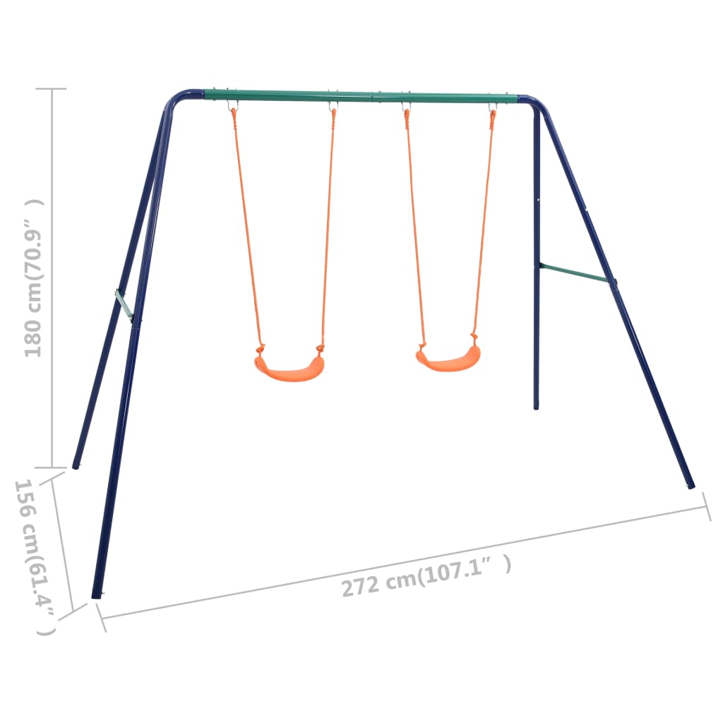 Playing on this swing set will be your children's favourite outdoor activity! Maximum 2 kids can play while enjoying a fresh breeze or a sunny day simultaneously. This swing set consists of a sturdy steel A-frame with 2 single swing seats. Thanks to its sturdy steel frame and plastic seats, the set is extremely durable and weather-resistant. It is also easy to assemble. All swings are securely fixed to the sturdy A-frame crossbar with sturdy brackets, bolts, hooks and ropes. The ground pins and all the necessary installation accessories are included in the delivery.