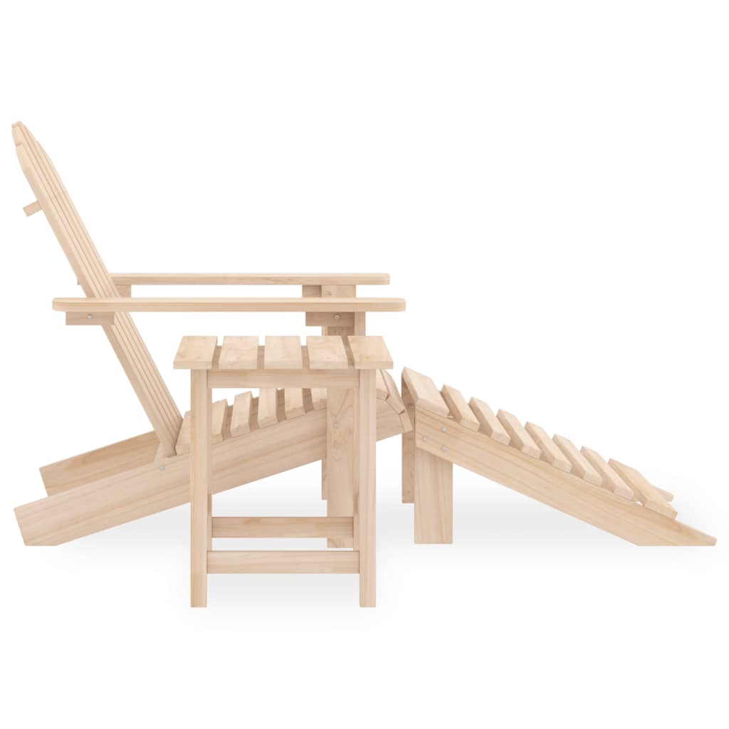 Relax and take a load off in the garden or on the patio with this trendy and comfortable Adirondack chair with ottoman and table! This garden chair with ottoman and table, crafted from solid fir wood, features a sturdy frame and is stable, making it easy to maintain and weather resistant. The table allows you to place your phone, sunglasses, drink and other small items. The ergonomically designed structure also ensures optimal comfort. Additionally, the ottoman is detachable and can provide extra support for your feet. With an elegant and timeless design, it will be a practical and classic addition to your outdoor living space. Note: In order to extend the life of your outdoor furniture, we recommend you to clean it regularly and do not leave it outdoors without protection unnecessarily.Clean: Use a mild soap solution.Storing: If possible, store in a cool, dry place indoors. If the product is stored outdoors, protect it with a waterproof cover. Wipe and dry the excess water or snow from flat surfaces after a rain or snowfall. Allow sufficient air circulation to avoid moisture-related damage.