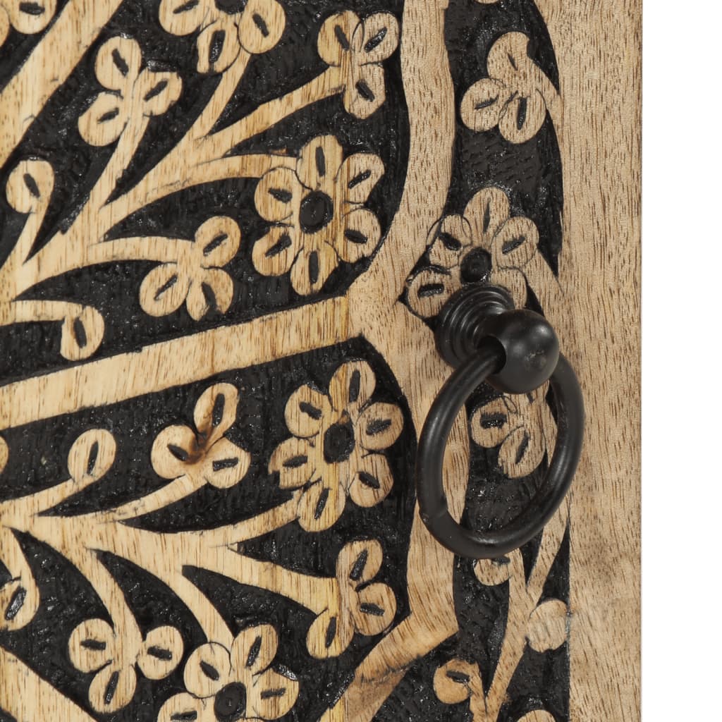 This bathroom cabinet is a great choice for your bathroom, making it tidy and organised! Solid mango wood: Solid mango wood is a strong, tropical hardwood that makes sturdy furniture. Its beautiful wood grains make every piece of furniture slightly different from the next. Made of solid mango wood, the bathroom storage cabinet is durable and stable.Ample storage space: This cabinet for bathroom offers ample storage space to keep your essentials well organised and within reach.Flexible door: You can install the door either on the left side or right side based on your own needs.Sturdy legs: The iron legs add the bathroom cupboard's sturdiness and stability.Retro style: This storage cabinet with hand-carved floral patterns brings the luxury of retro style to your interior, being the focal point of your room. Good to know:Each item is unique with variations in colours and grains. The delivery is random, ensuring the exclusivity and individuality of your product. Warning:To prevent it from tipping over, this product must be used with the provided wall attachment device.