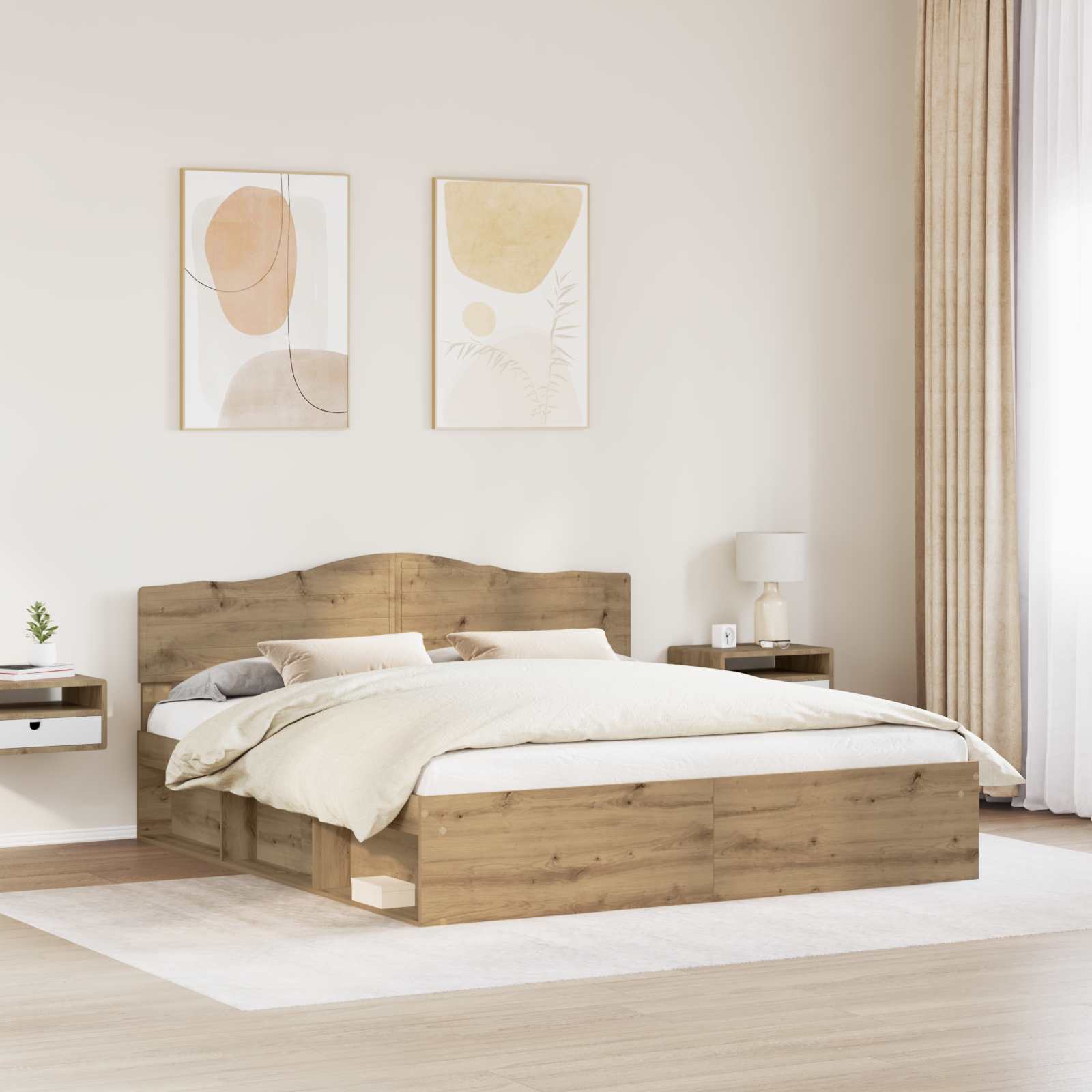 This Modern Bed Frame is perfect for those who value both style and functionality. Designed with clean lines and minimal ornamentation, it lends a sophisticated touch to any bedroom. The frame's sleek rectangular shape suits contemporary interiors, seamlessly fitting into spaces that prioritize simplicity. Whether paired with neutral hues or vibrant accents, this frame enhances the ambiance by embodying refined elegance. From loft apartments to traditional homes, it’s a canvas for personal style and comfort. Materials: Crafted with a combination of Engineered Wood and Solid Pine Wood, this bed frame demonstrates resilience and aesthetic appeal. The combination of these materials ensures long-term use while providing warmth and character to the bedroom space. Included Components: This set includes a bed frame with a solid framework made from Engineered Wood and a headboard crafted from Solid Pine Wood. Together, they create a sturdy structure that supports restful, undisturbed sleep. Features /Function /Design: With a Modern design focused on simplicity and functionality, this bed frame resonates with spaces valuing clean aesthetics. Its intuitive structure offers enduring support while maintaining a stylish, contemporary presence in the bedroom. Recommended Uses: Ideal for varying room setups, this bed frame suits master bedrooms, guest rooms, or studio apartments. It provides a versatile foundation for promoting personalized design styles, delivering comfort and sophistication. Care &Maintenance: For a spotless appearance, simply wipe the bed frame with a damp cloth. This straightforward maintenance routine ensures the frame remains in pristine condition, preserving its visual and functional integrity over time.