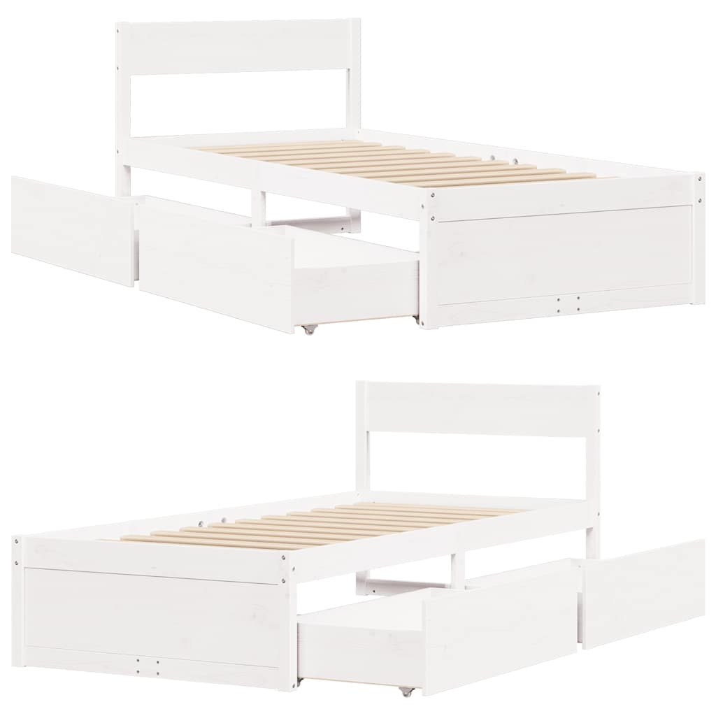 Add a modern touch to your bedroom with this bed frame with drawers! It makes a practical and decorative addition to your living space. Stable and long-lasting frame: Solid pinewood is known for its strength and durability. Its straight grains and distinctive knots contribute to its rustic charm.Plywood slats: The plywood slats provide good weight distribution, ensuring that the mattress stays in place with every twist and turn of your body during sleep.Storage function: The included bed drawers provide ample storage space for storing your essentials, keeping your room clean and tidy.Versatile headboard: This bed frame comes with a headboard that provides excellent back support when you sit up in bed to read or watch TV, while also serving as a decorative element. Good to know:A mattress is not included with this bed. We do offer a various selection of mattresses. You can check our shop for a matching mattress.